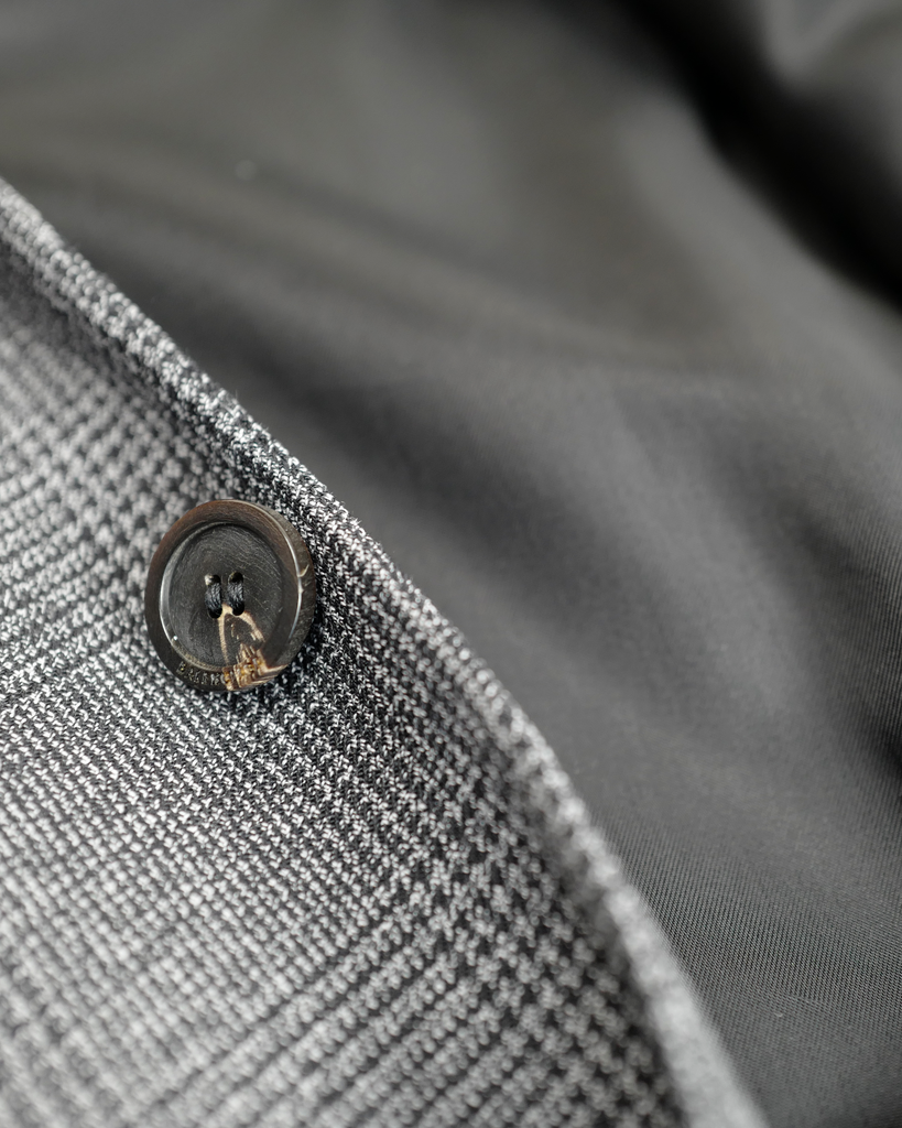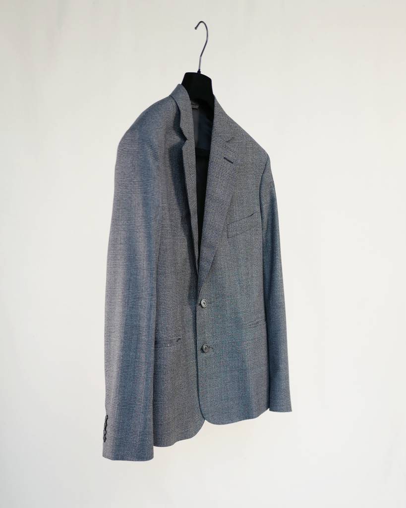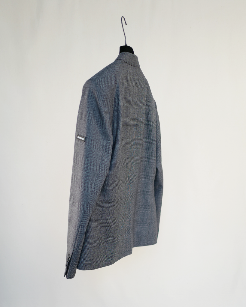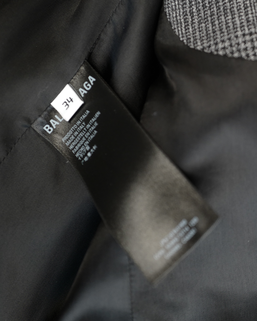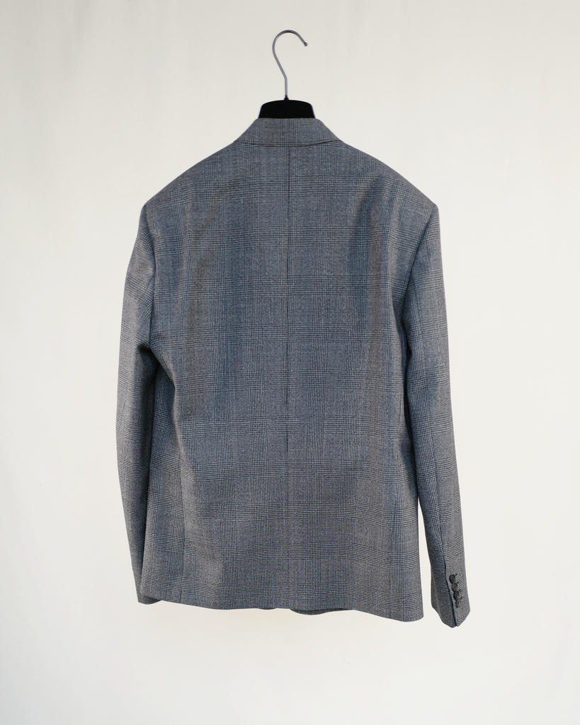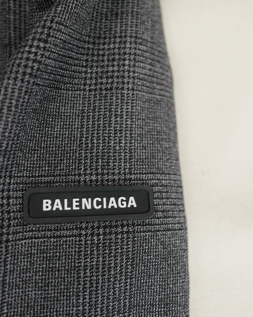 Prince of Wales-check wool-twill suit jacket with two buttons and buttoned sleeves. Relaxed fit. Baleciaga logo in rubber on left shoulder.
