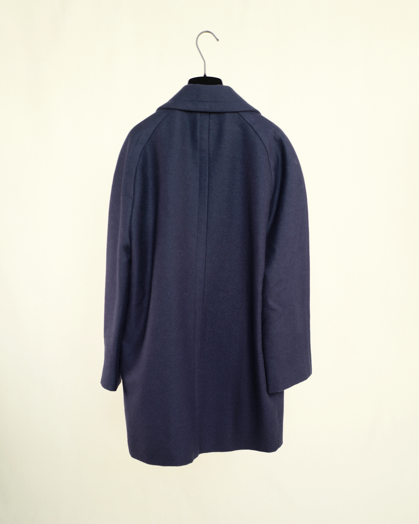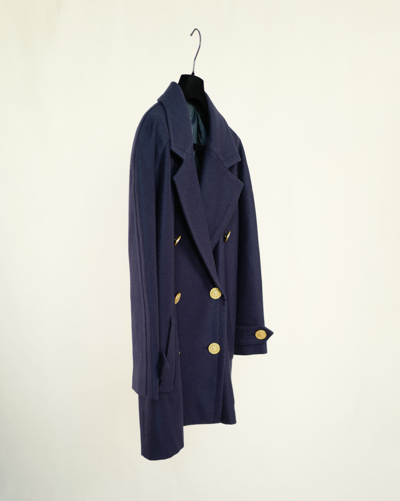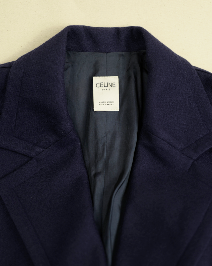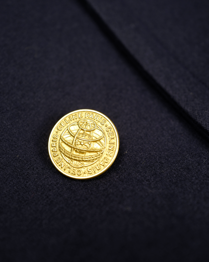 Navy blue double breasted Céline wool/cashmere coat with big golden buttons. Shorter model. Decorated buttons. Wider lapel.
