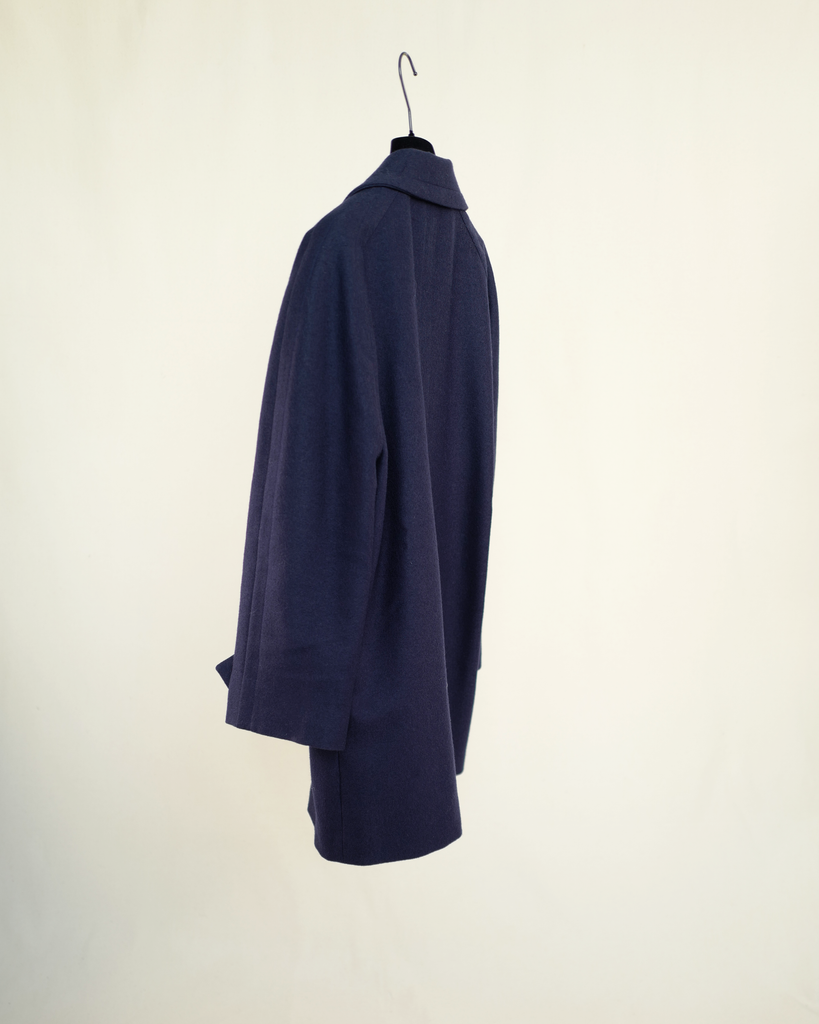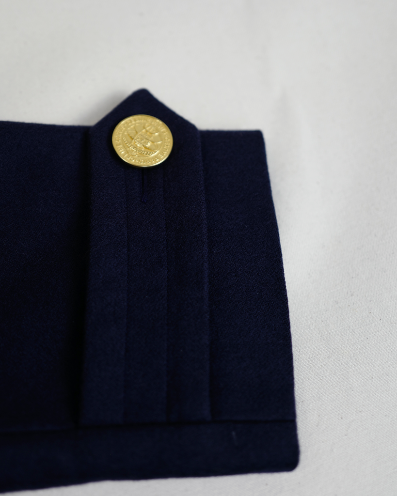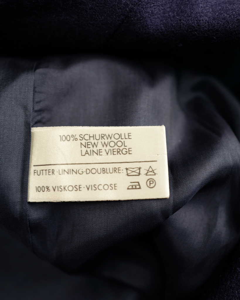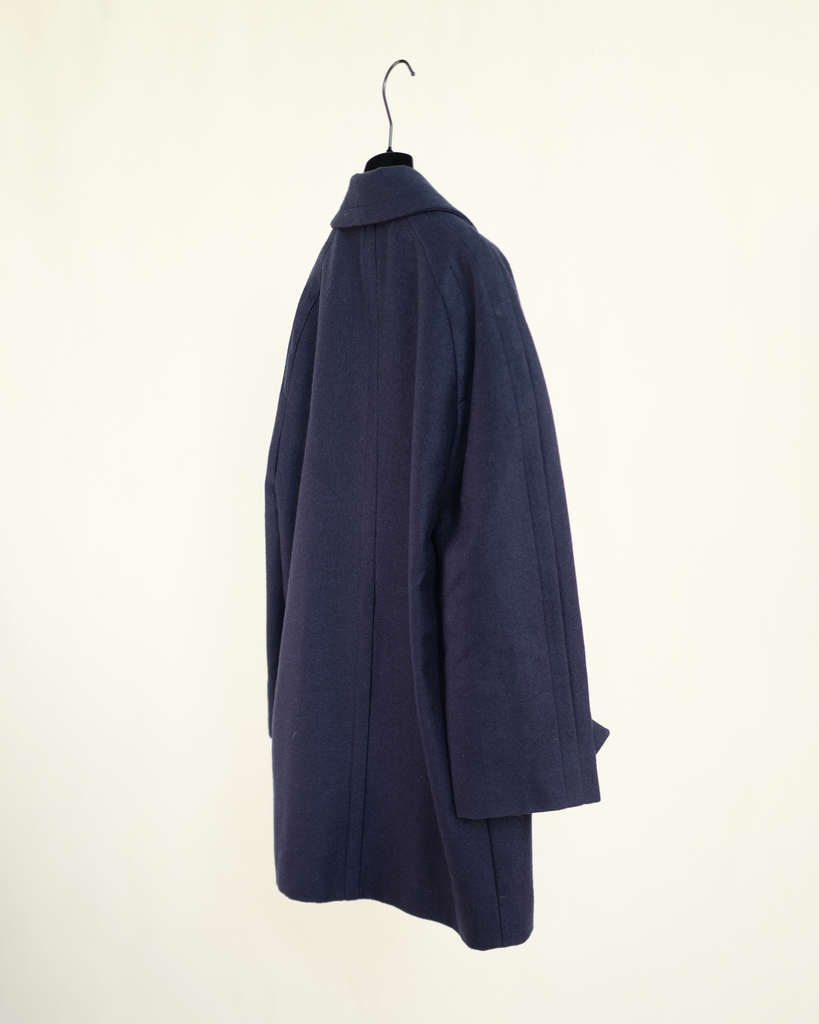 Navy blue double breasted Céline wool/cashmere coat with big golden buttons. Shorter model. Decorated buttons. Wider lapel.