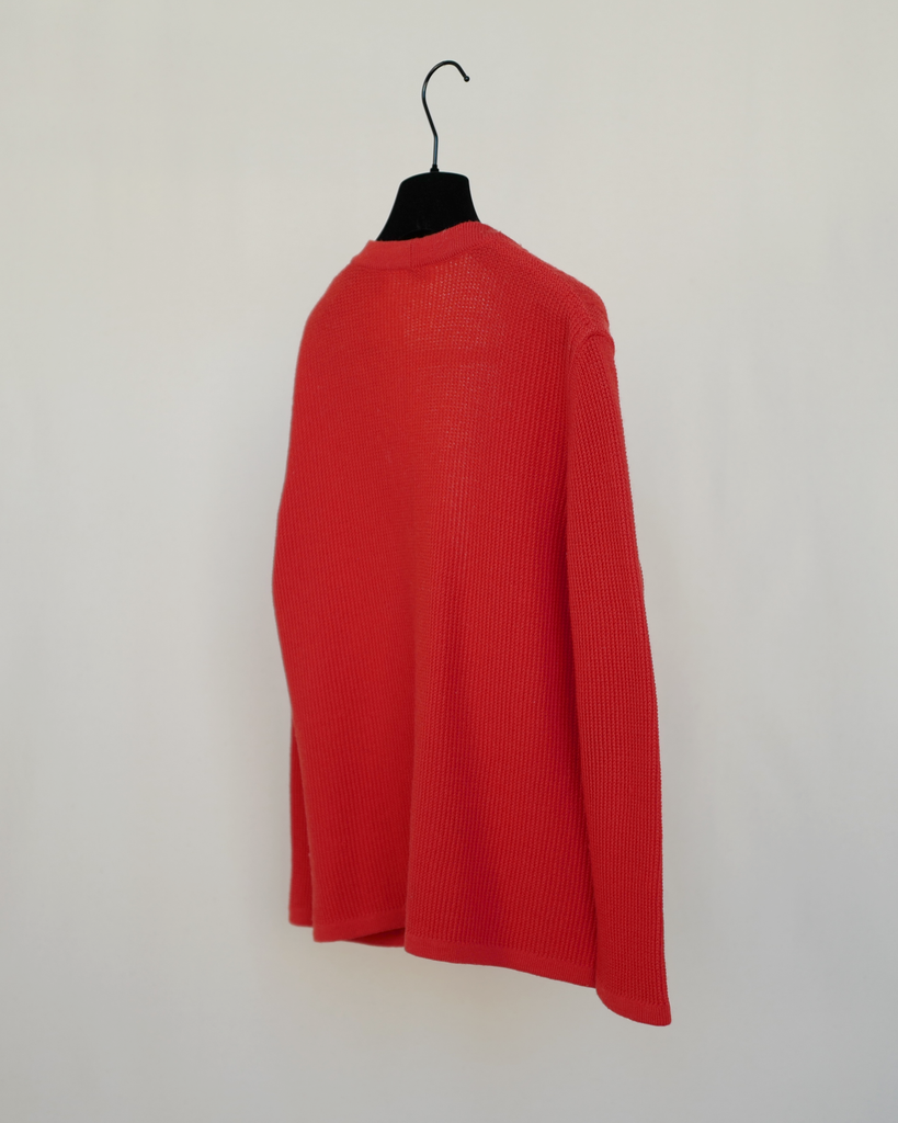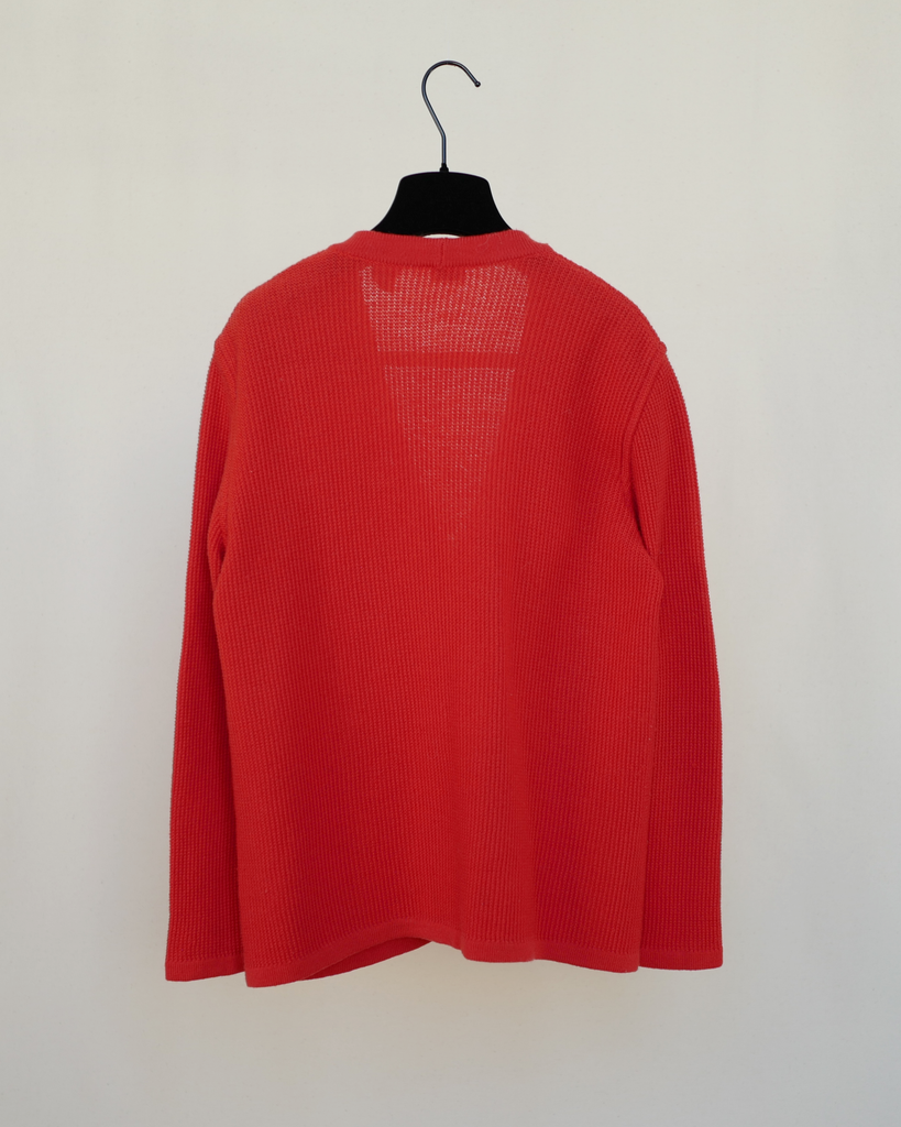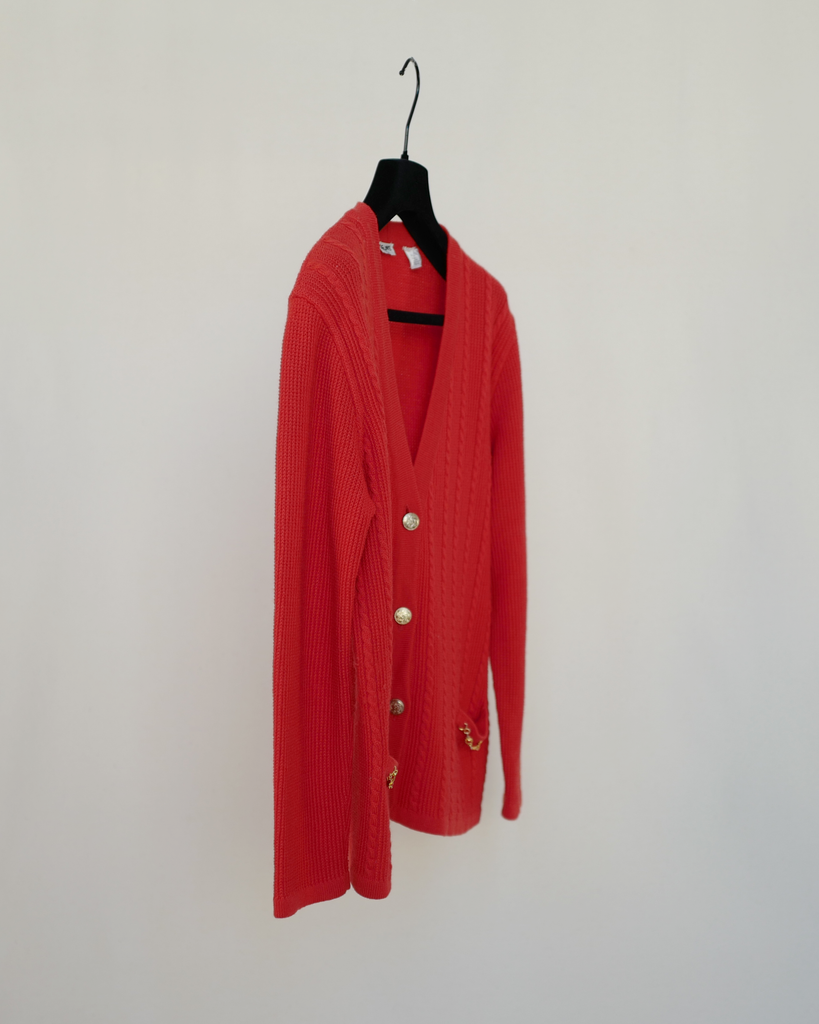 Red vintage Céline knitted cardigan. Closes with golden detailed buttons. Golden chains with matching red details decors the pockets.