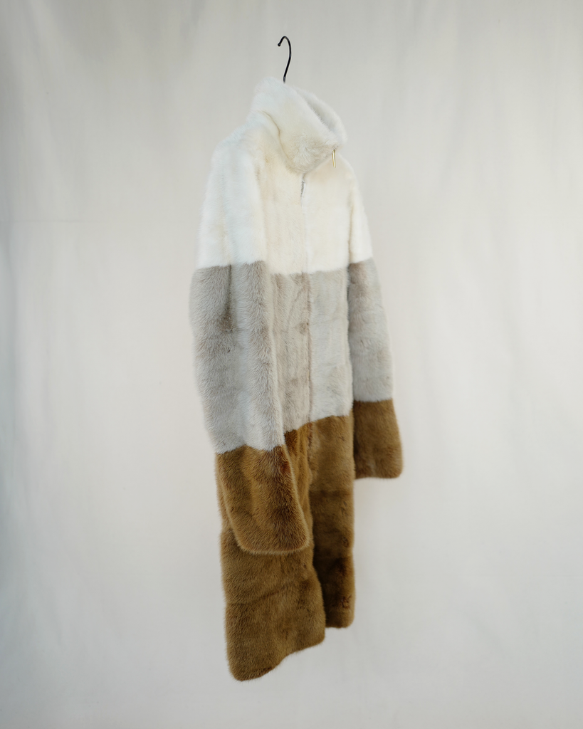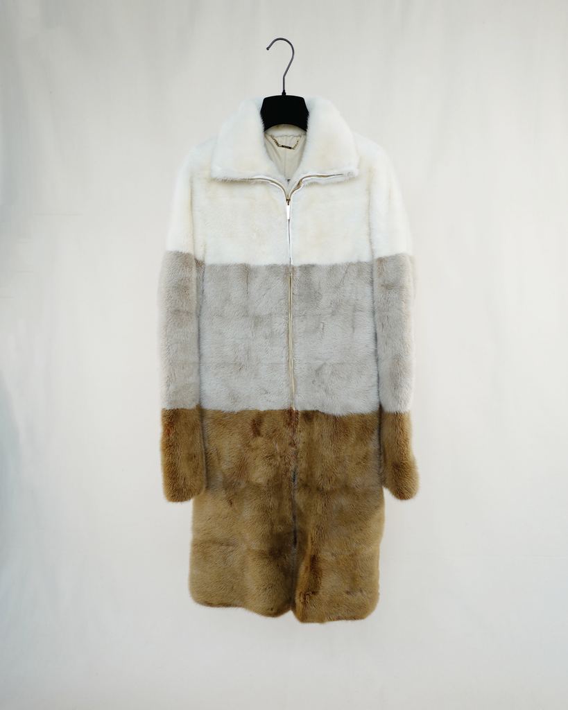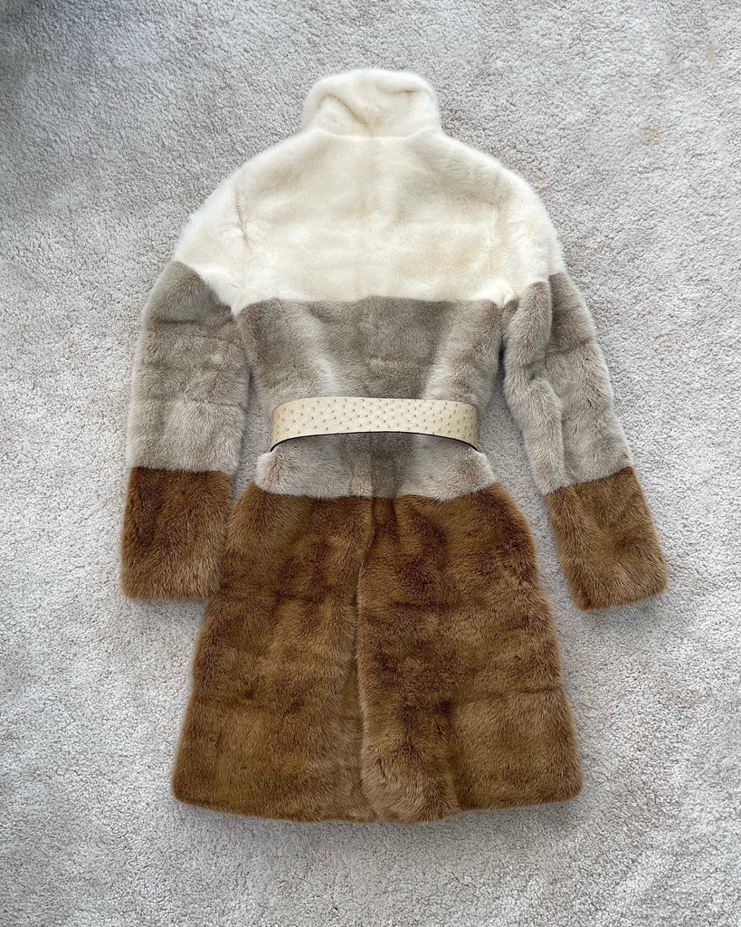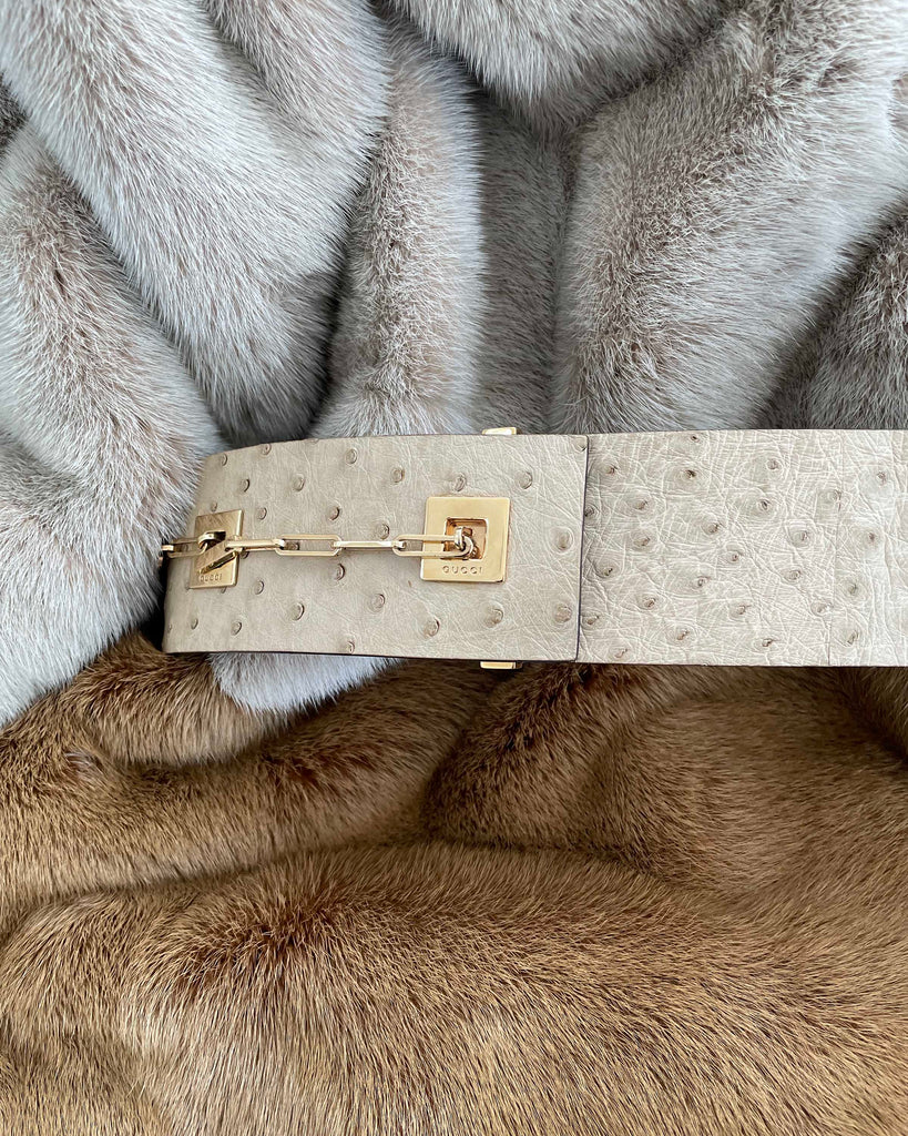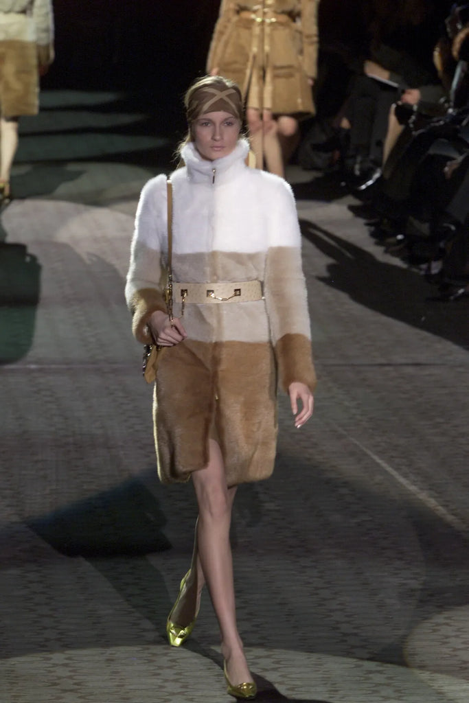 Beautiful three colour ombre fur coat with gold details and original osterich belt as seen on the runway for Tom Ford's Gucci fall winter 2000 show. A y2k gem. soft lamb leather lining.