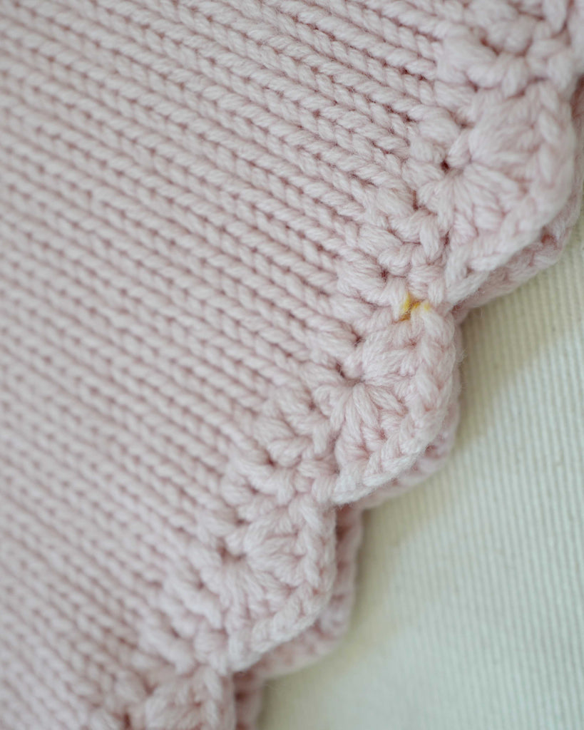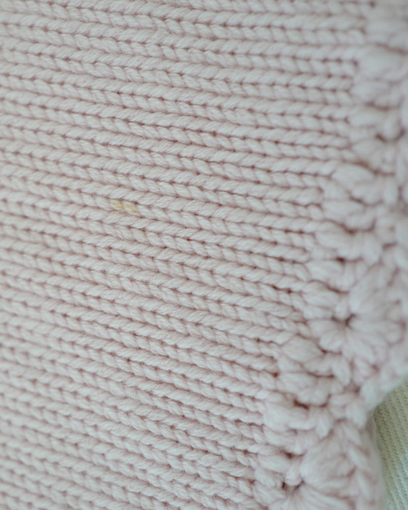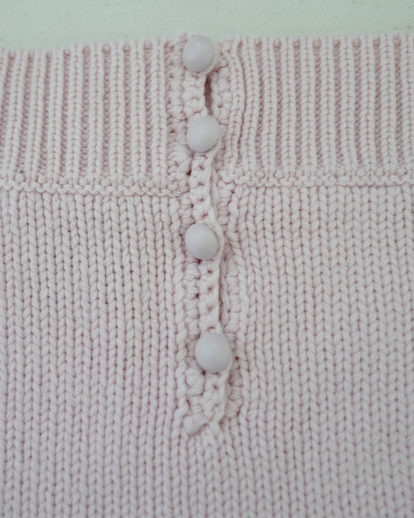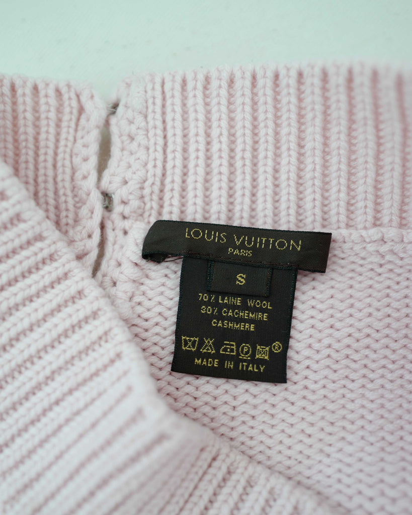 Pastel pink Louis Vuitton knitted skir. Ribbed knit at waist. Crochet application at hemmed. Matching buttons in back.