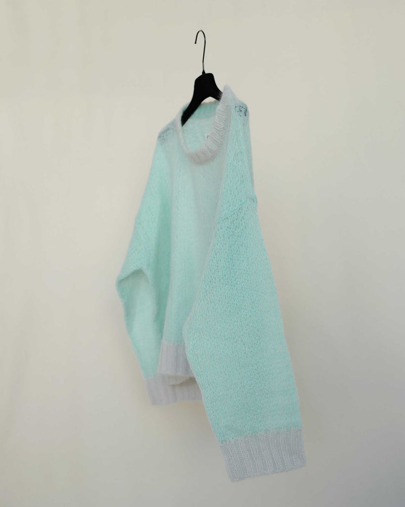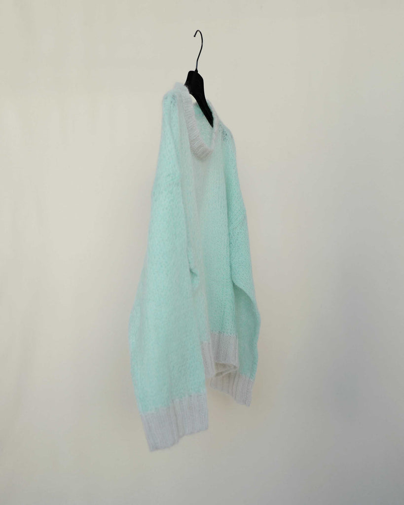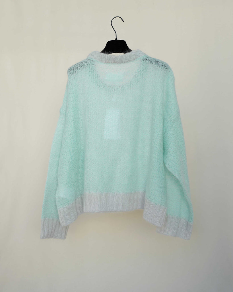 Light knitted fluffy Maison Margiela (1) sweater. Light turquoise with light grey cuffs and collar.