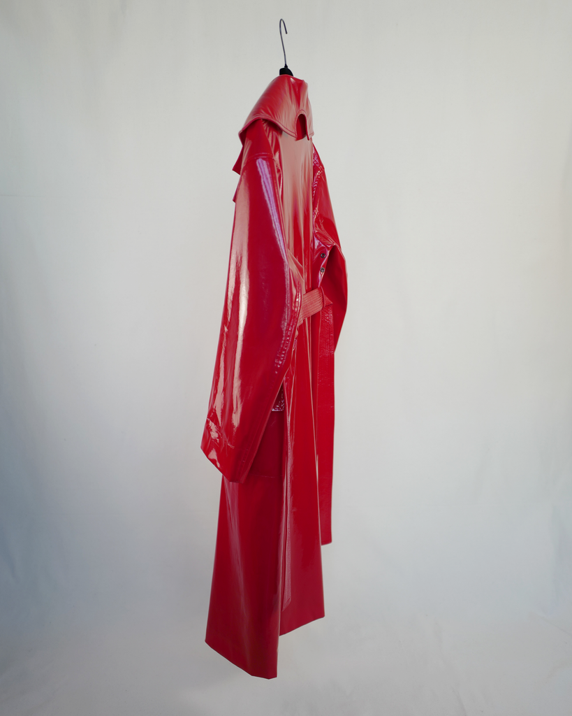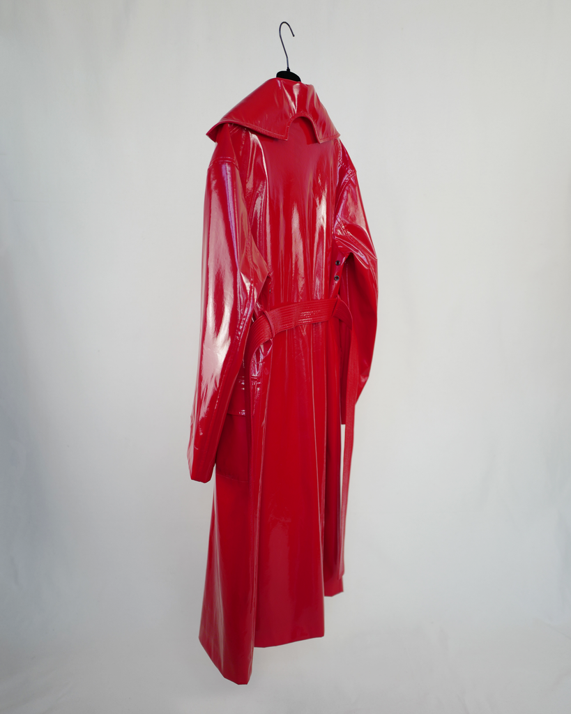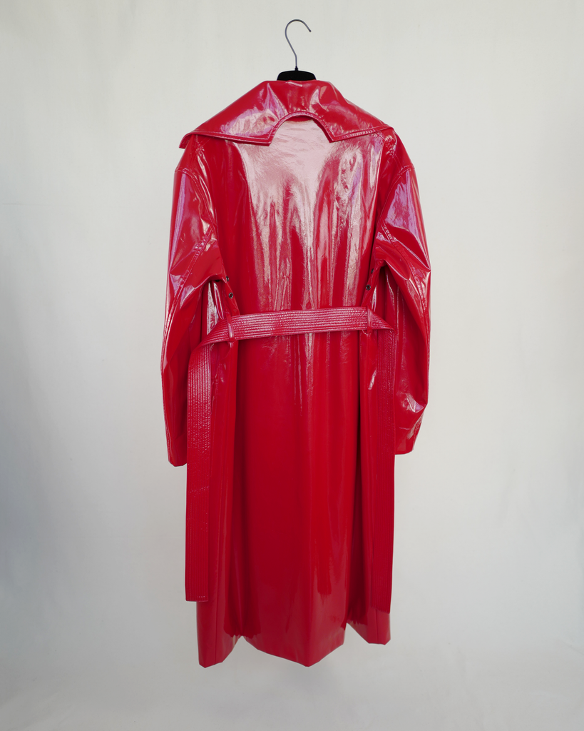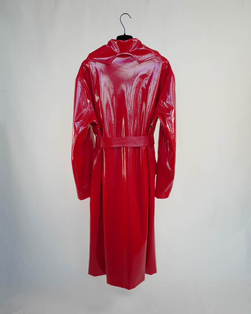 Long glossy vinyl coat with waist bank in classic trench-model. Removable belt. Closable collar. Underarm ventilation. Two front pockets.
