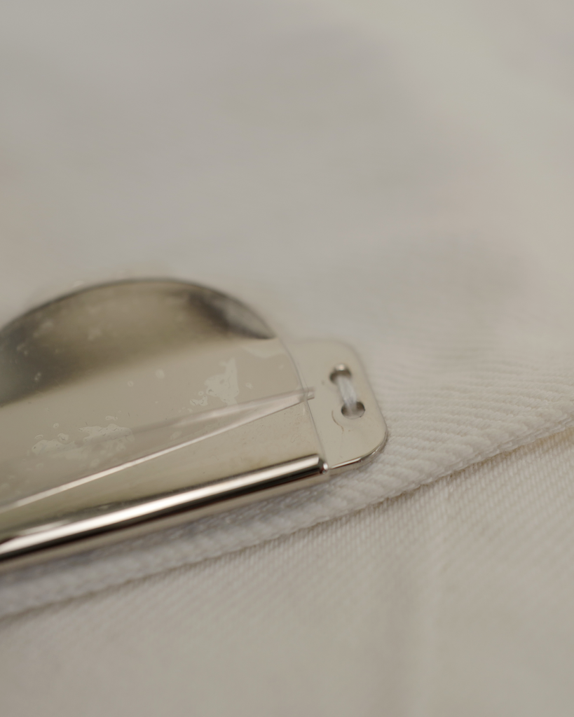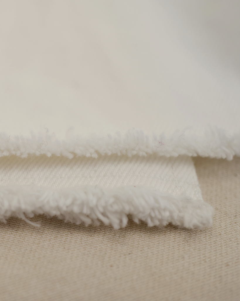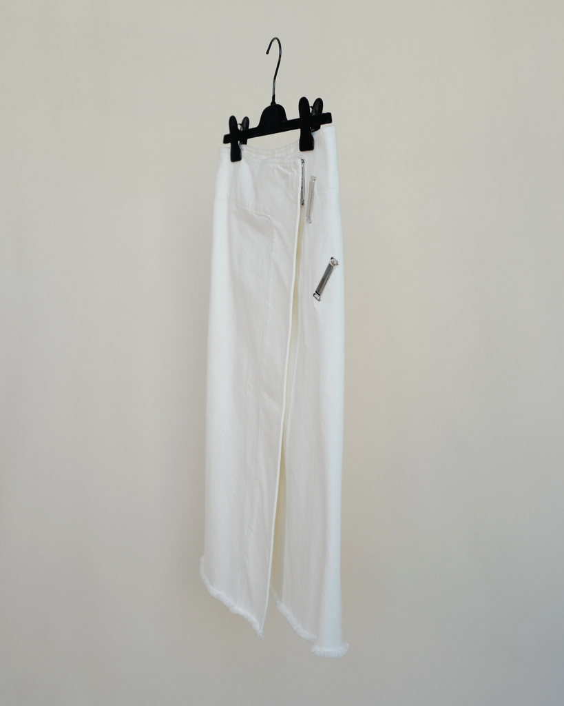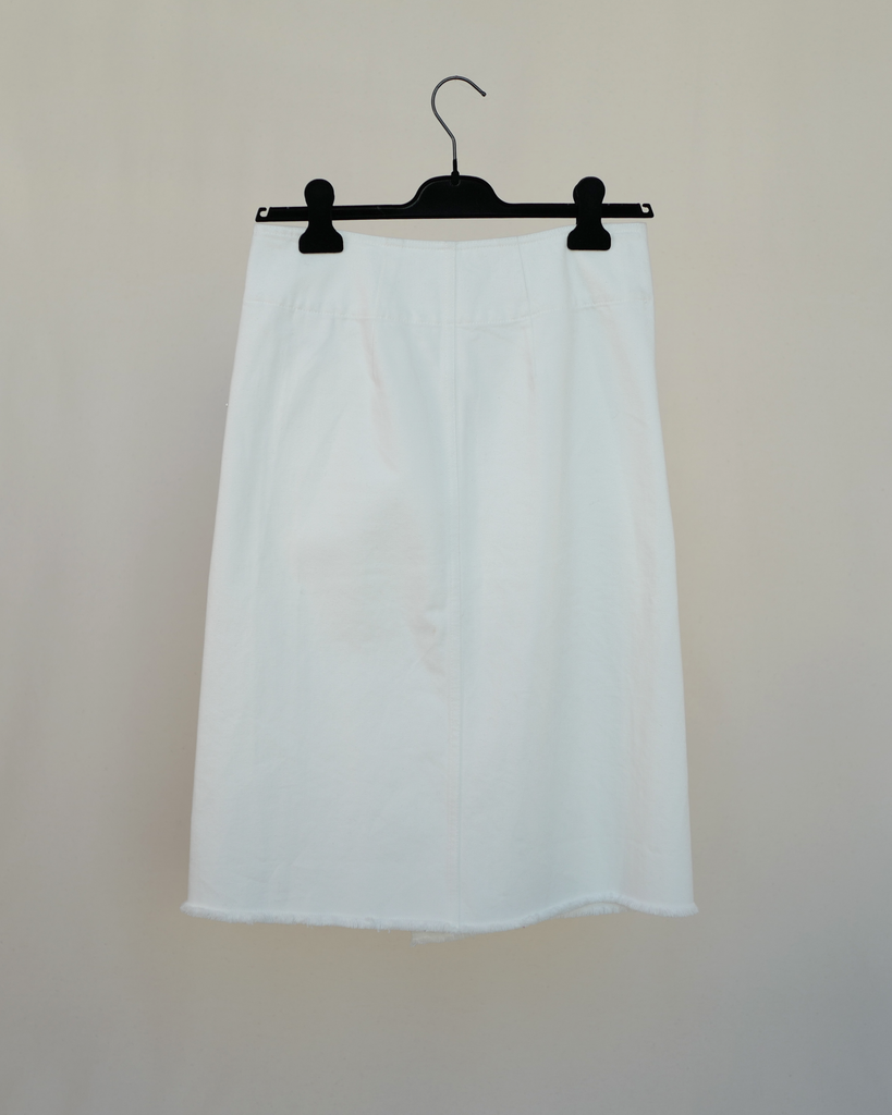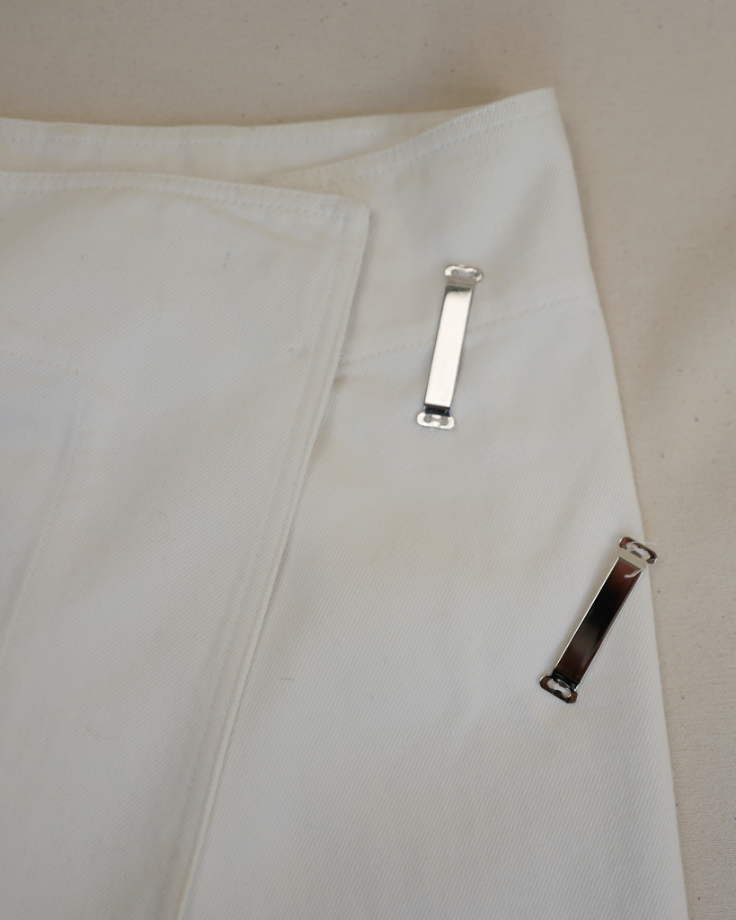 White wrap Céline jeans skirt with fringed edges by Phoebe Phillo. Can be worn high raise (S-M) or on low rise (XS-S). Closed with hidden button and silver hooks. Can be tightened or loosened. Edges are fringed but secured with seam.