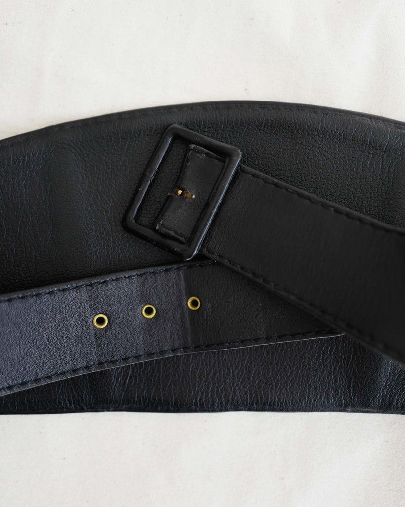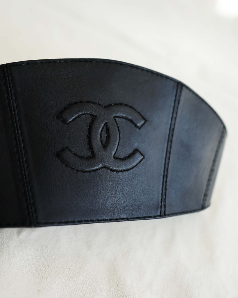 Rare runway Chanel leather corset belt in black with big CC logo in front. Gold clips with serie number and logo. Seen in multiple looks on the AW 1994 runway.