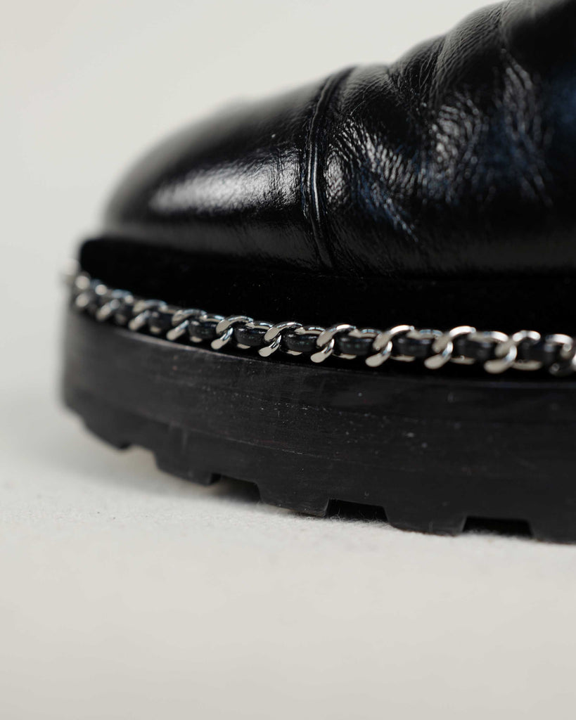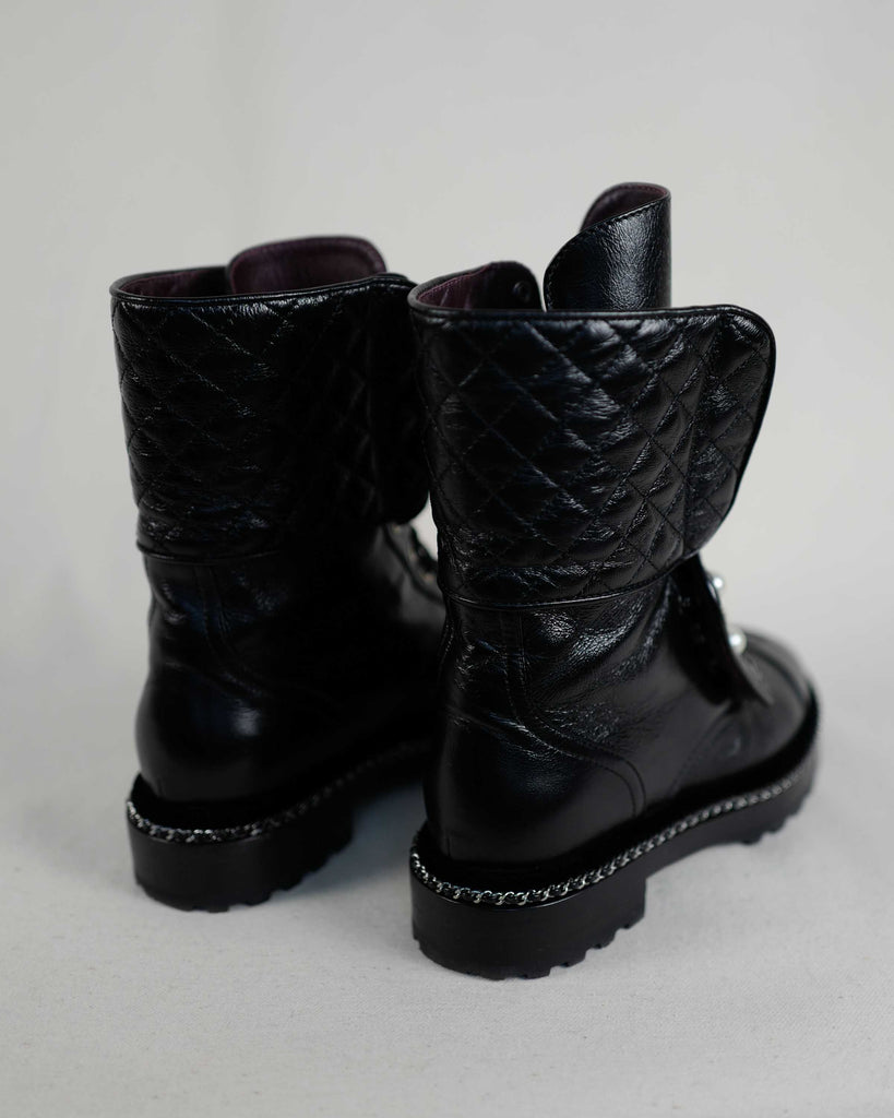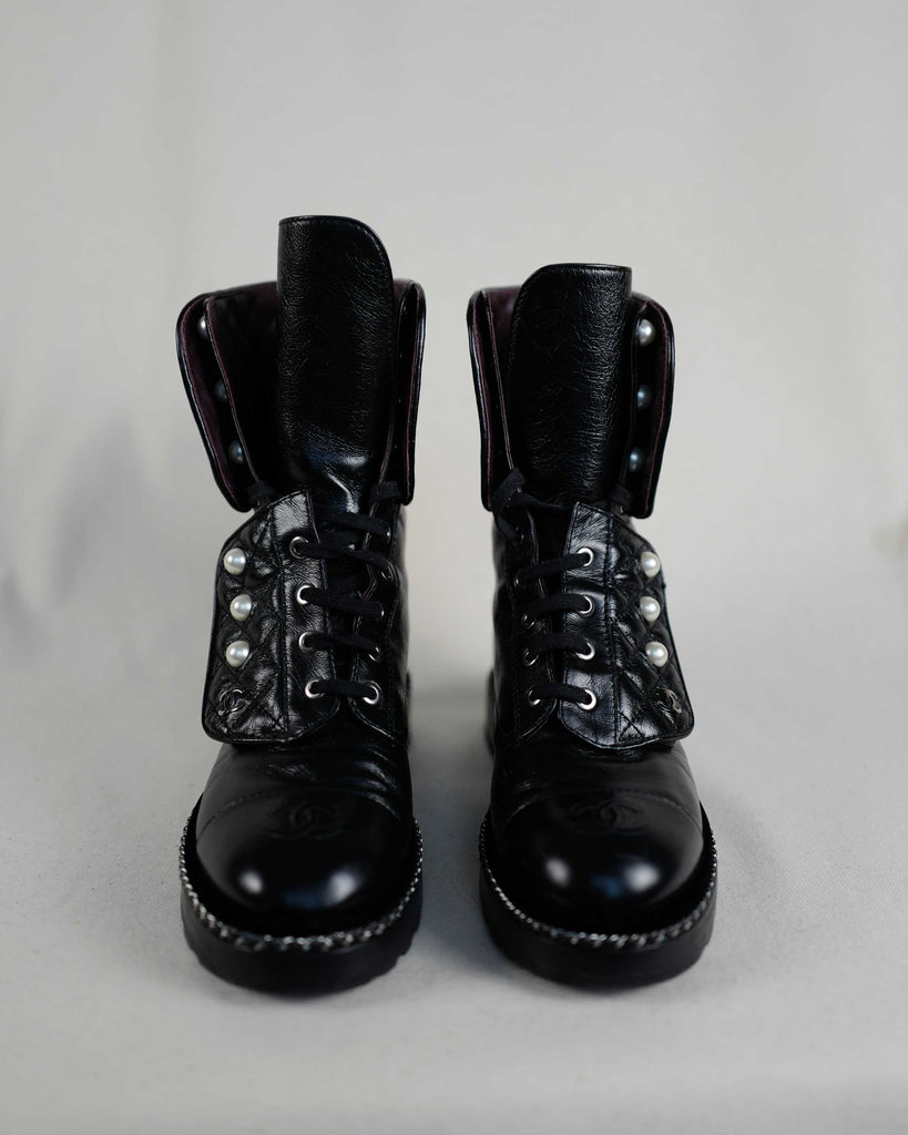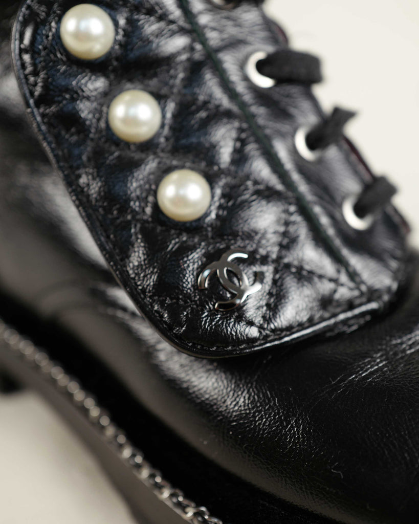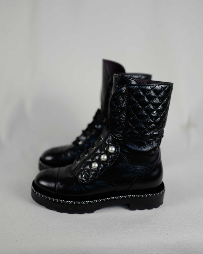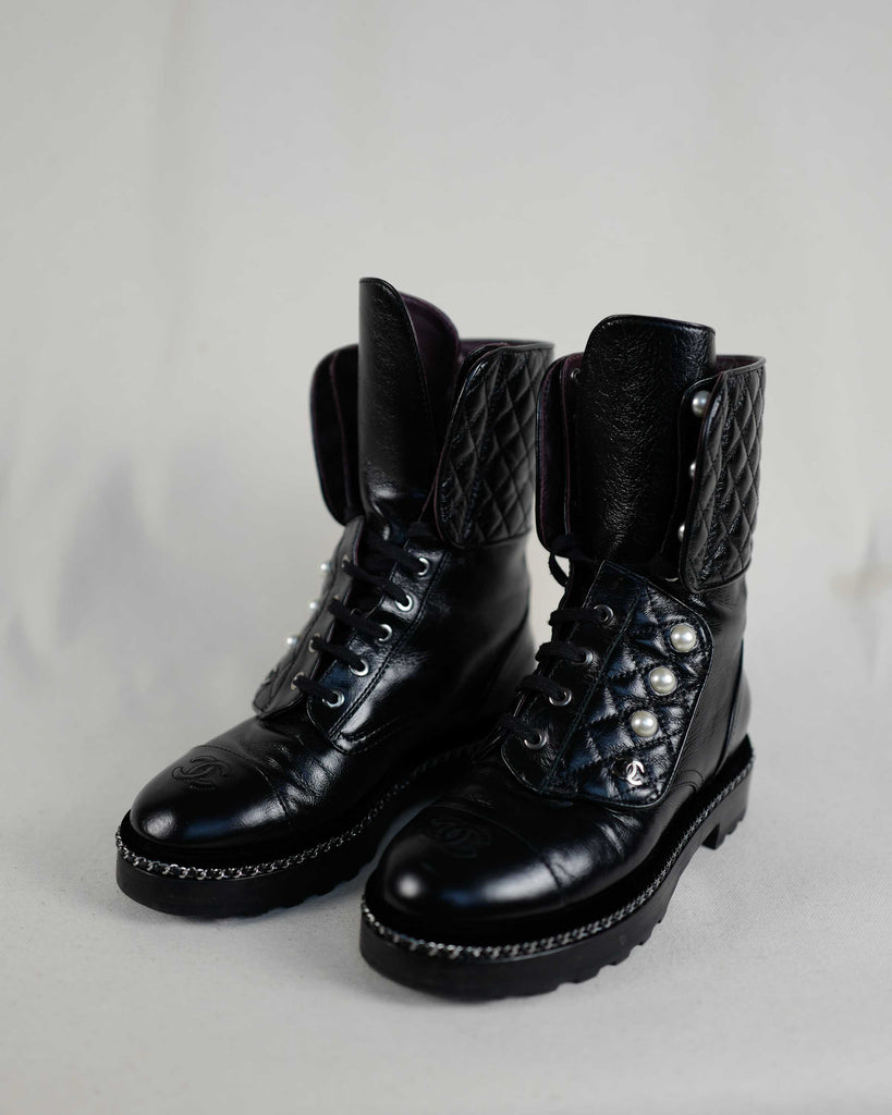 Black calf high boots in leather with gun metal chainlink and pearls from fall winter 2017. Inside Bordeaux red lambskin. Classic Chanel element such as the padded back of the calf. Metal Chanel logo on top of the shoes. Leather Chanel logo on toes.