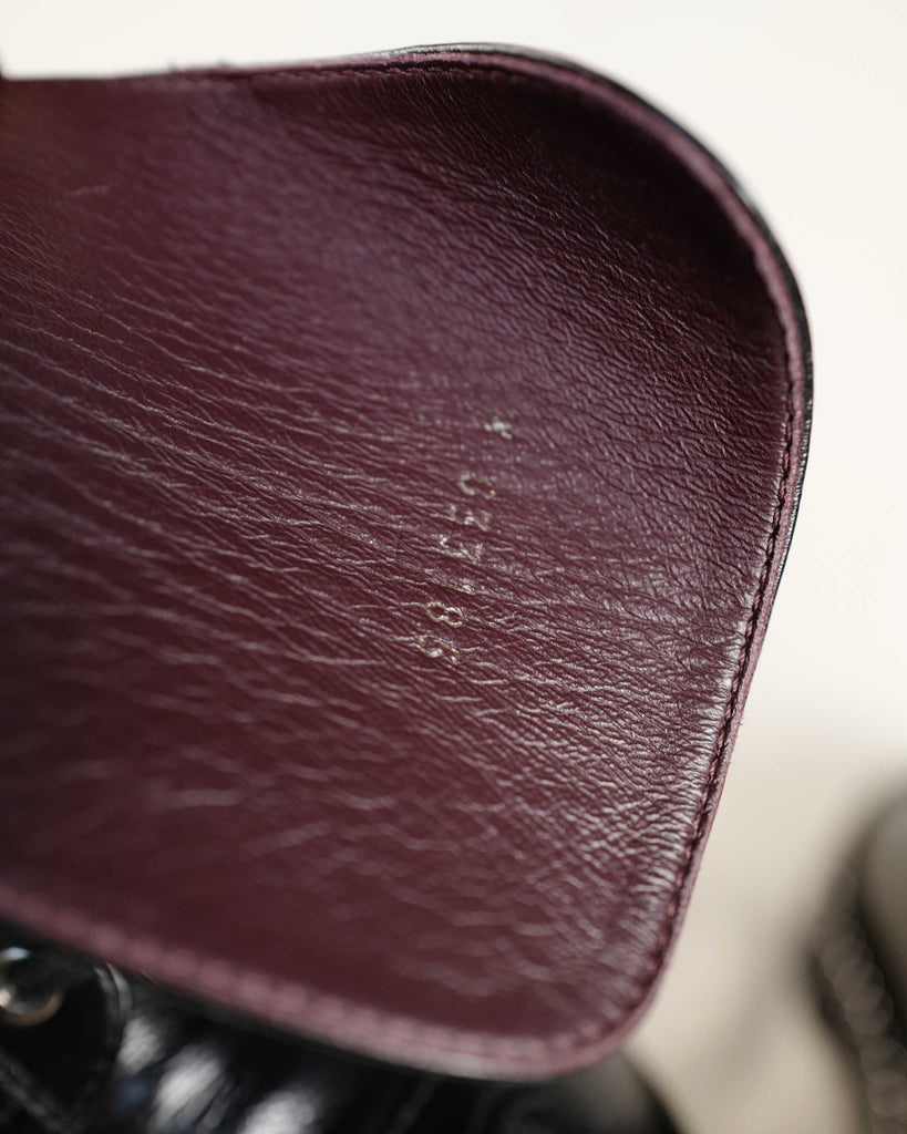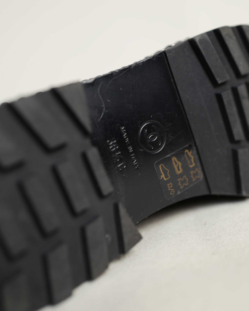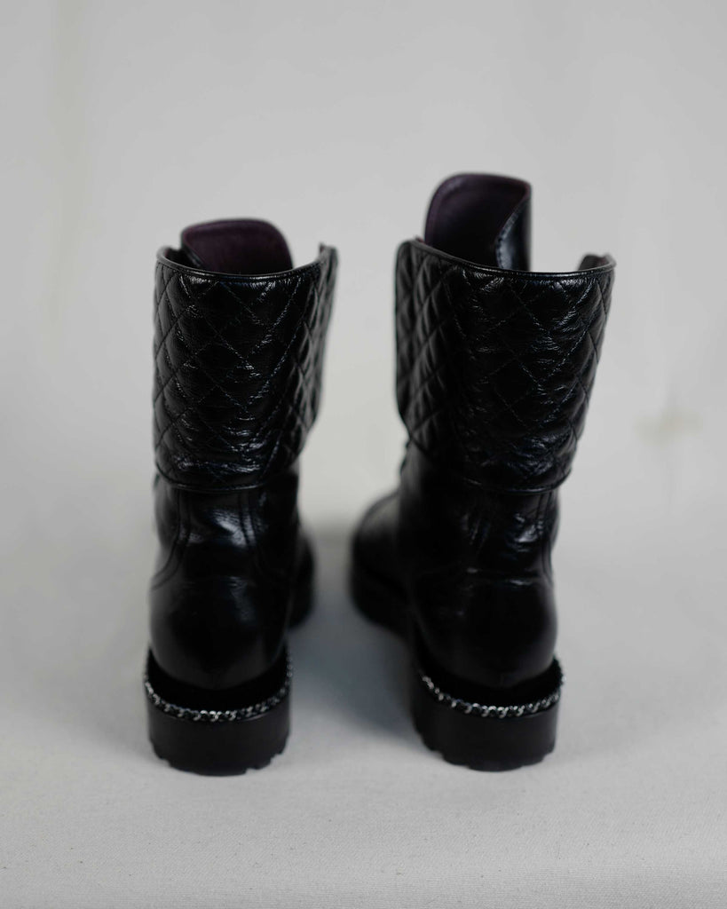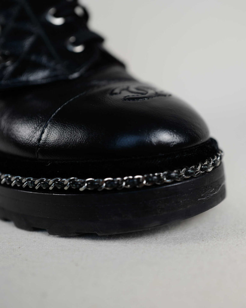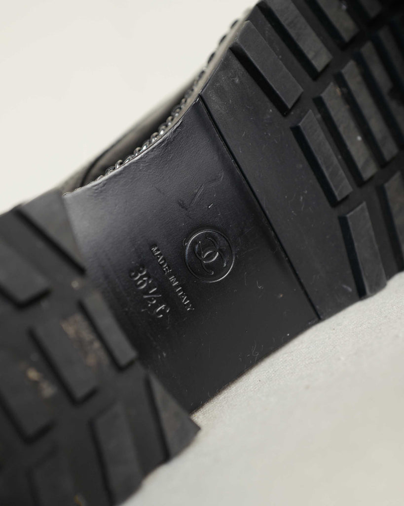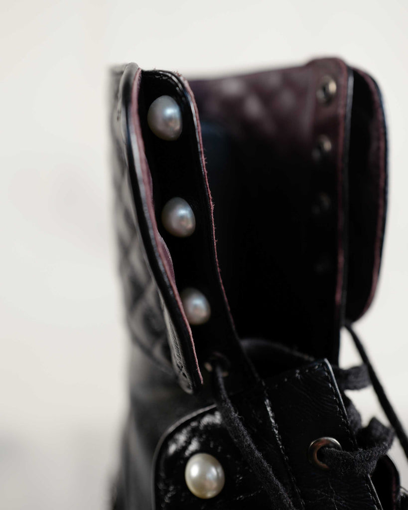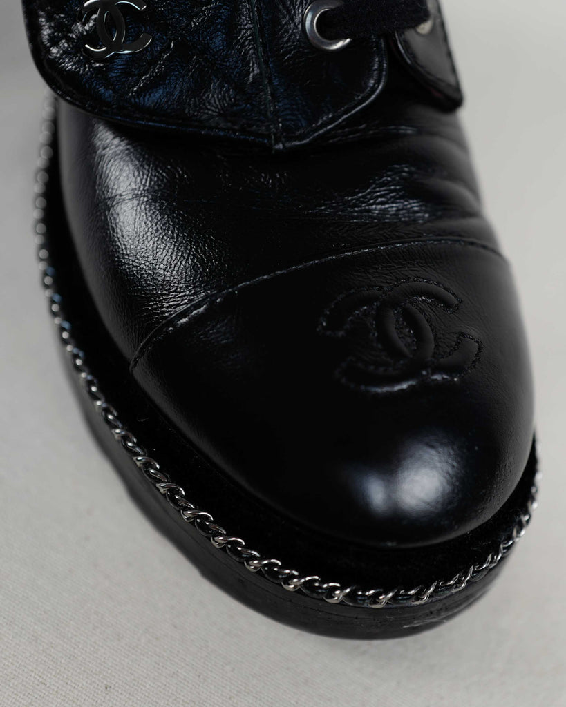 Black calf high boots in leather with gun metal chainlink and pearls from fall winter 2017. Inside Bordeaux red lambskin. Classic Chanel element such as the padded back of the calf. Metal Chanel logo on top of the shoes. Leather Chanel logo on toes.