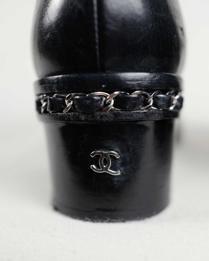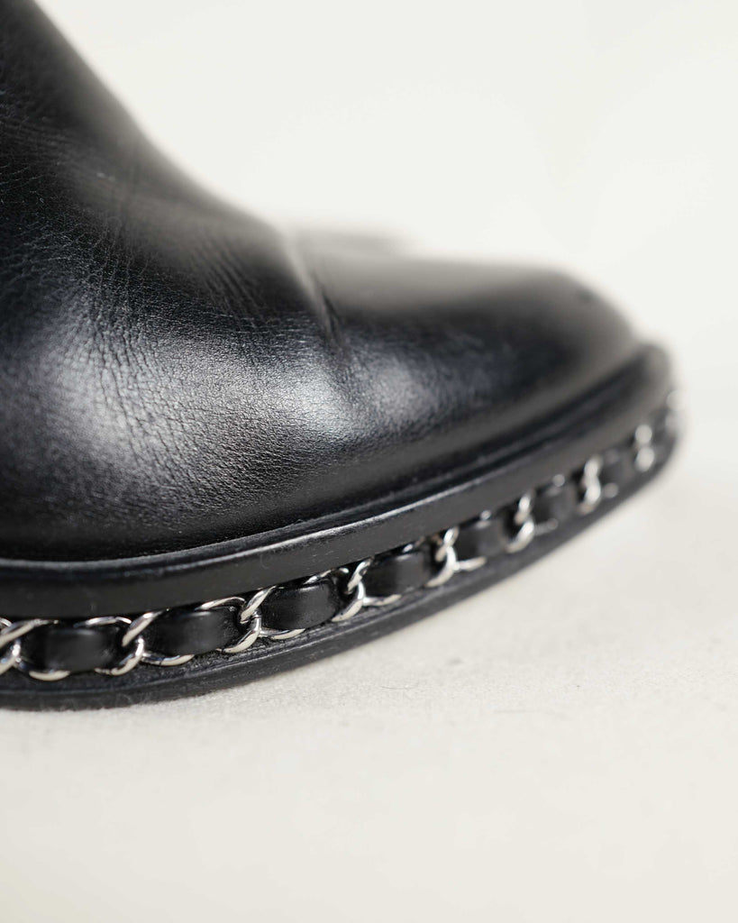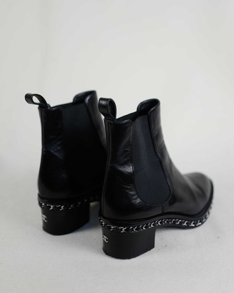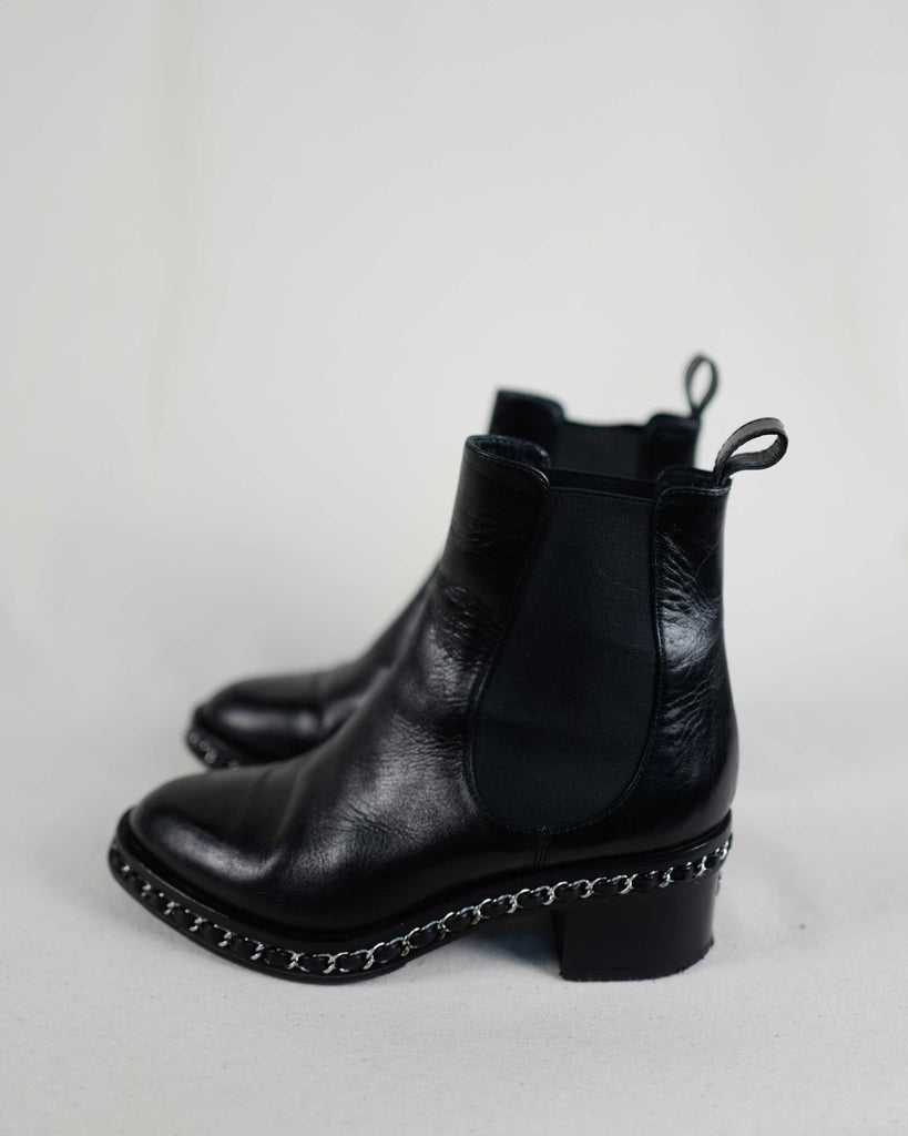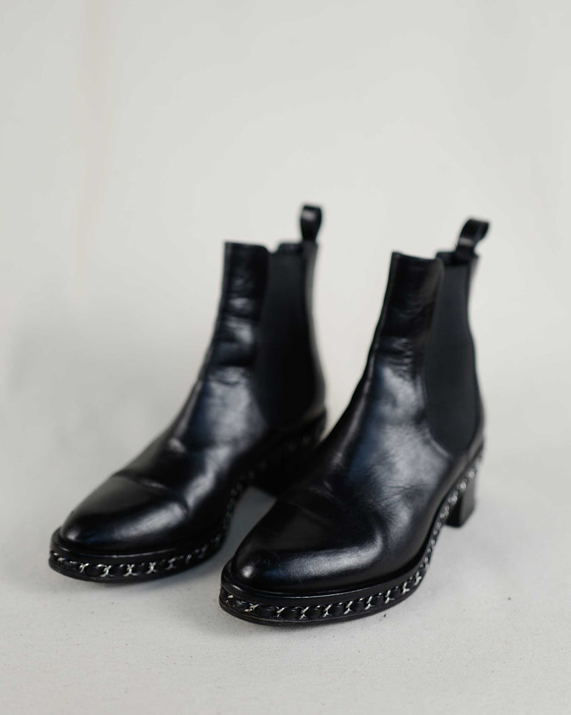 Black Chanel Chelsea boots with leather and chain detail on sole. Chanel logos on both heels.