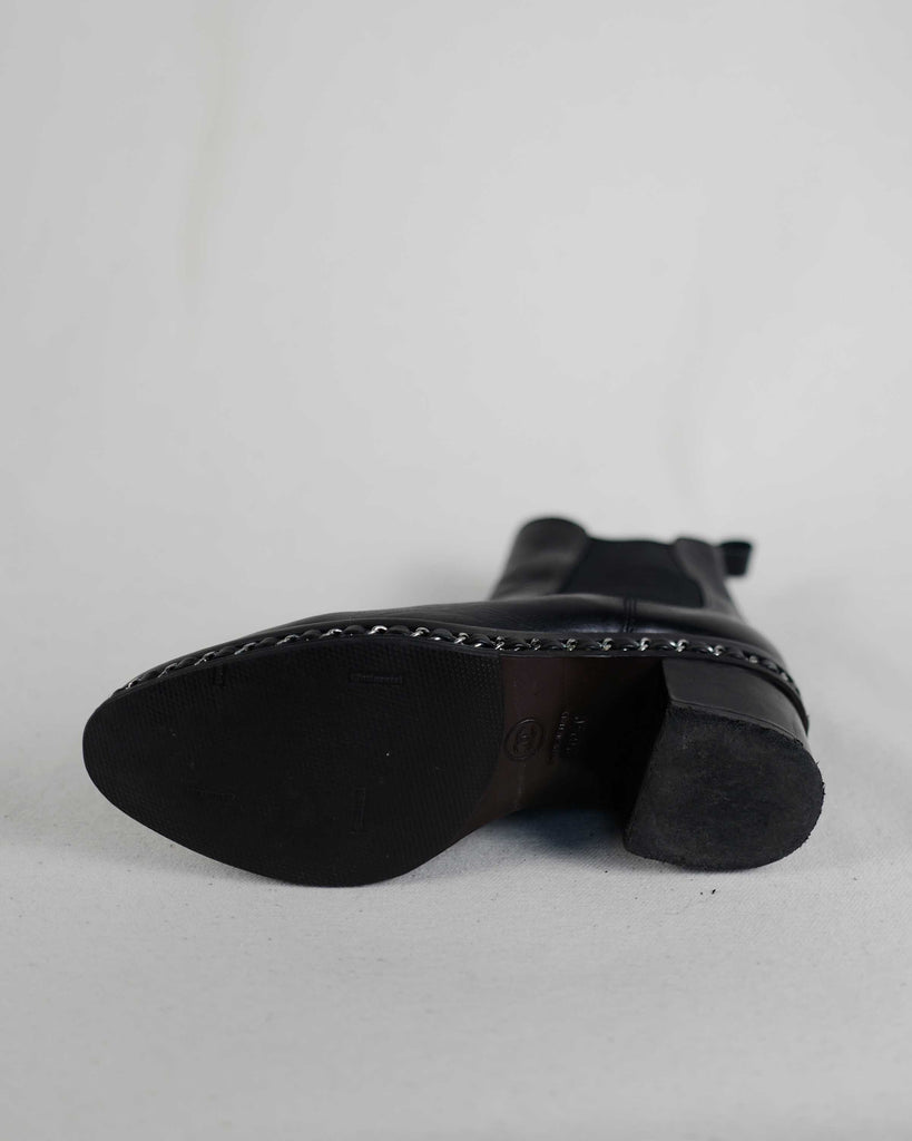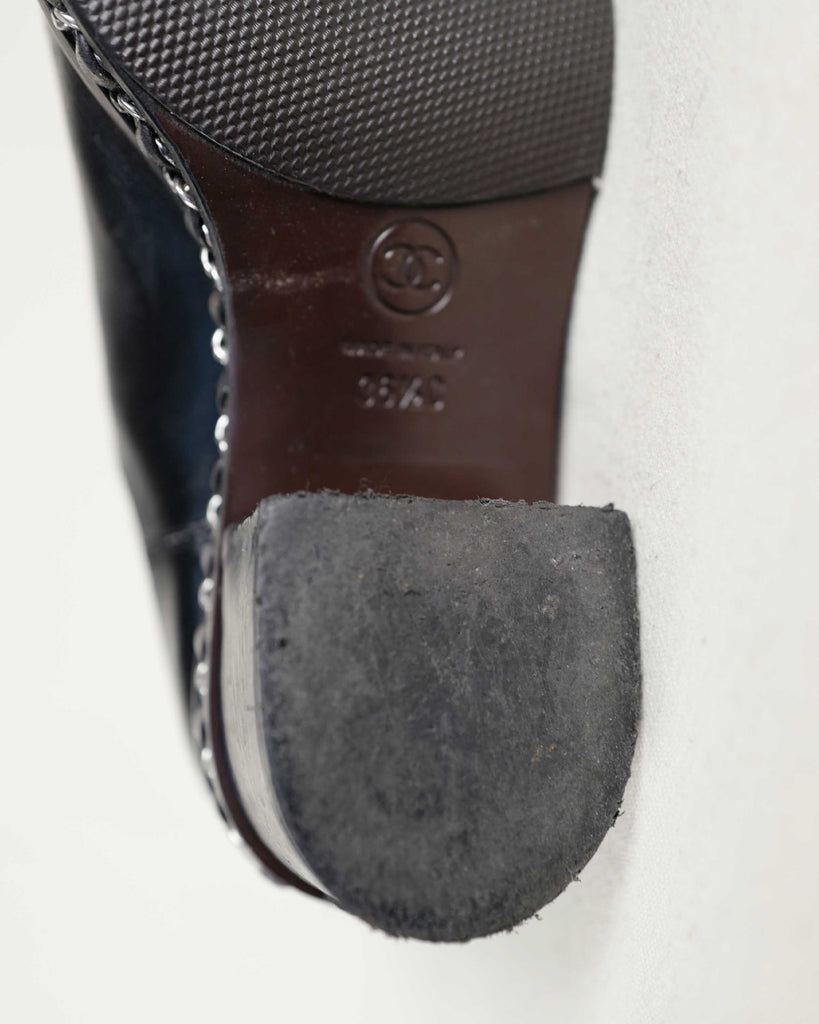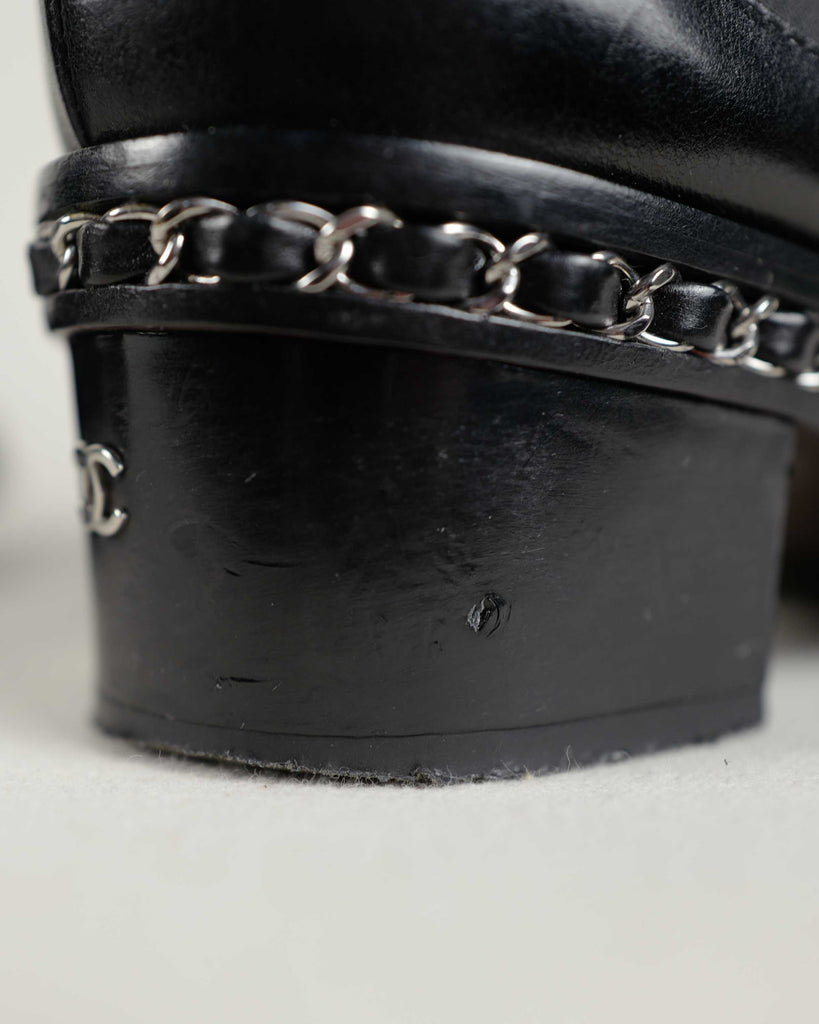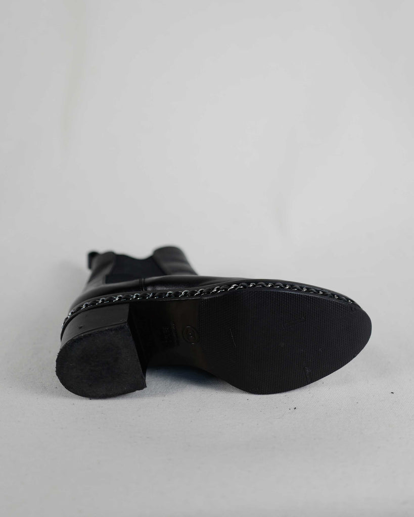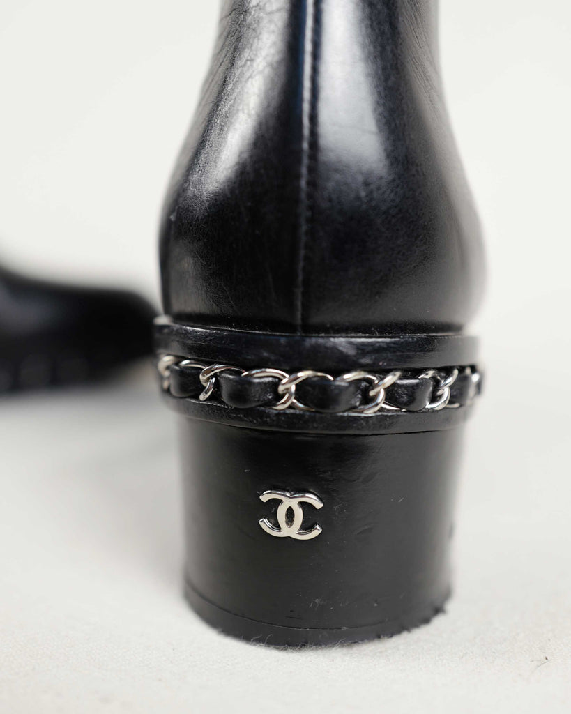 Black Chanel Chelsea boots with leather and chain detail on sole. Chanel logos on both heels.