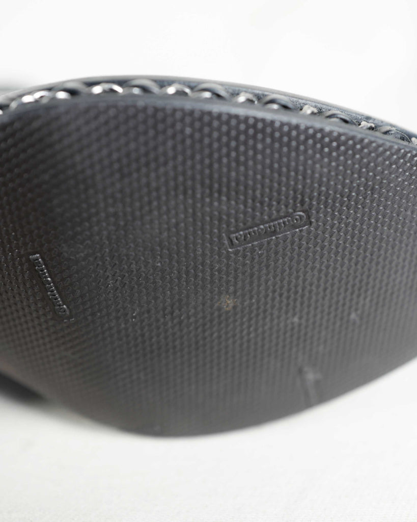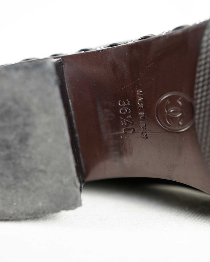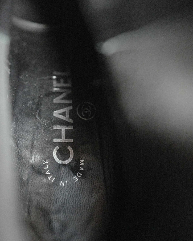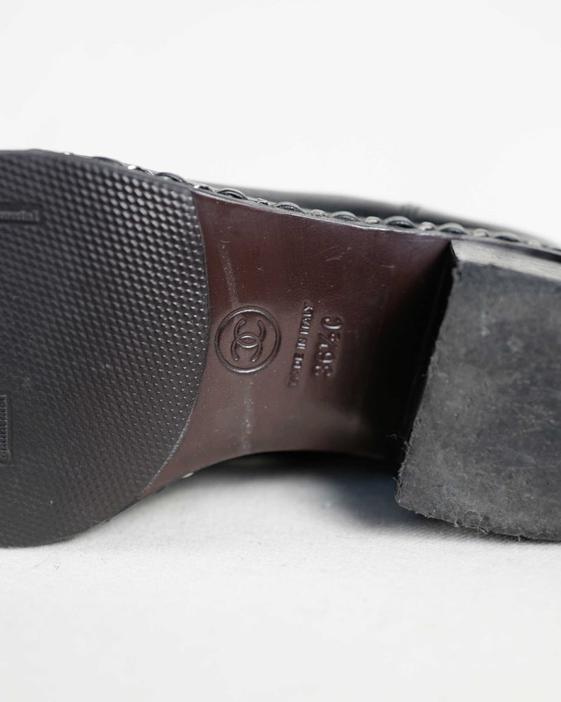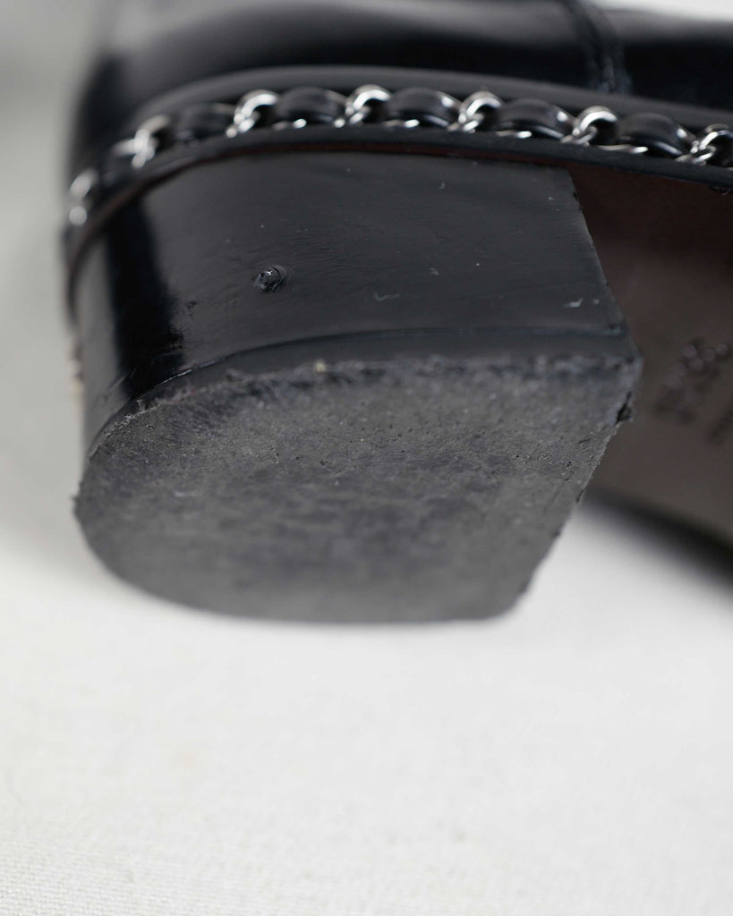 Black Chanel Chelsea boots with leather and chain detail on sole. Chanel logos on both heels.
