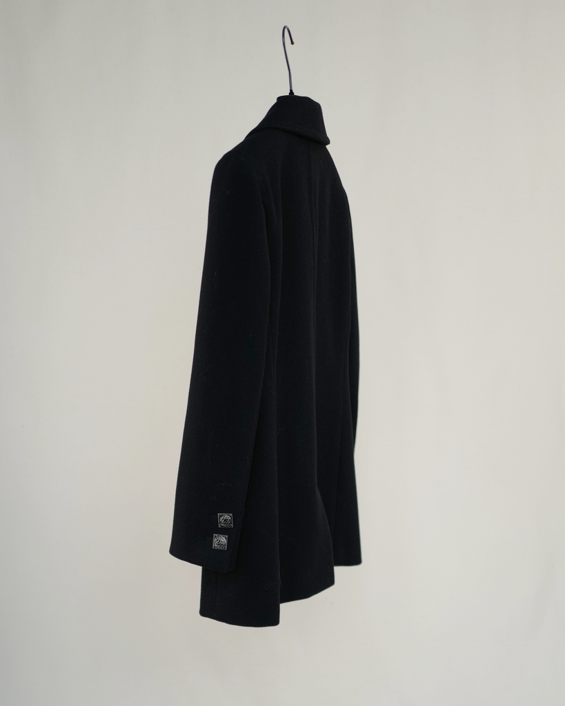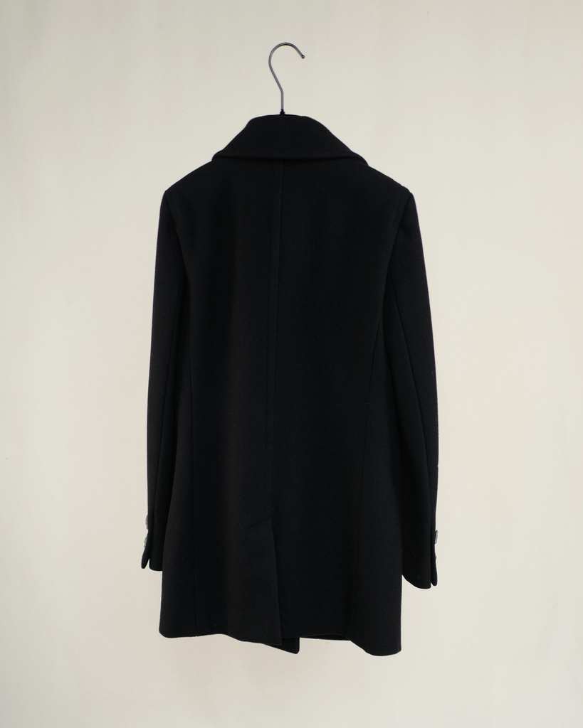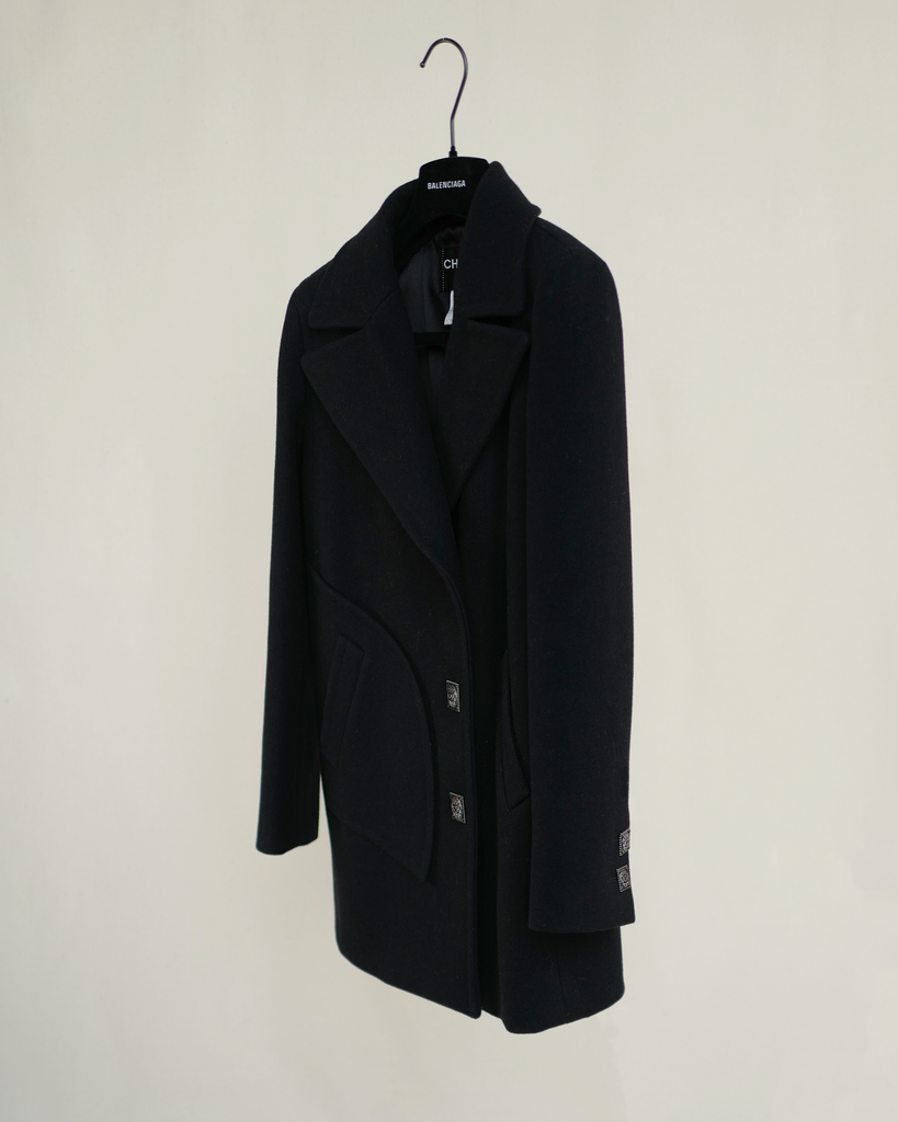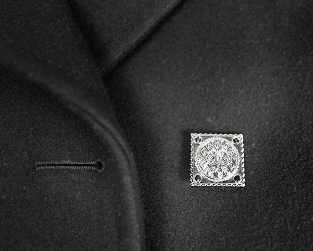 Black, short Chanel runway coat from Karl Lagerfeld's Metiers D'Art collection Paris Byzance. Rounded outer laid pockets and squared ornamented buttons with CC logo.