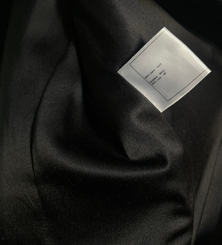100% wool, lining. 100% silk