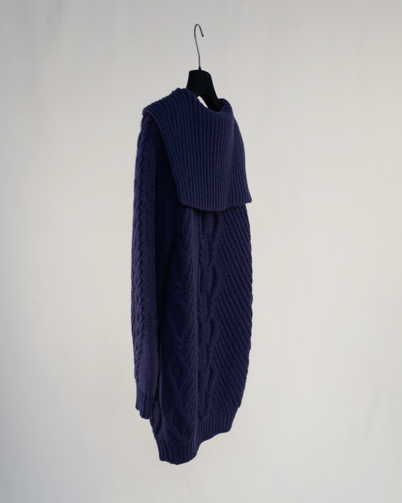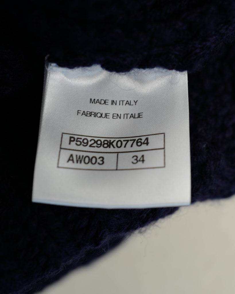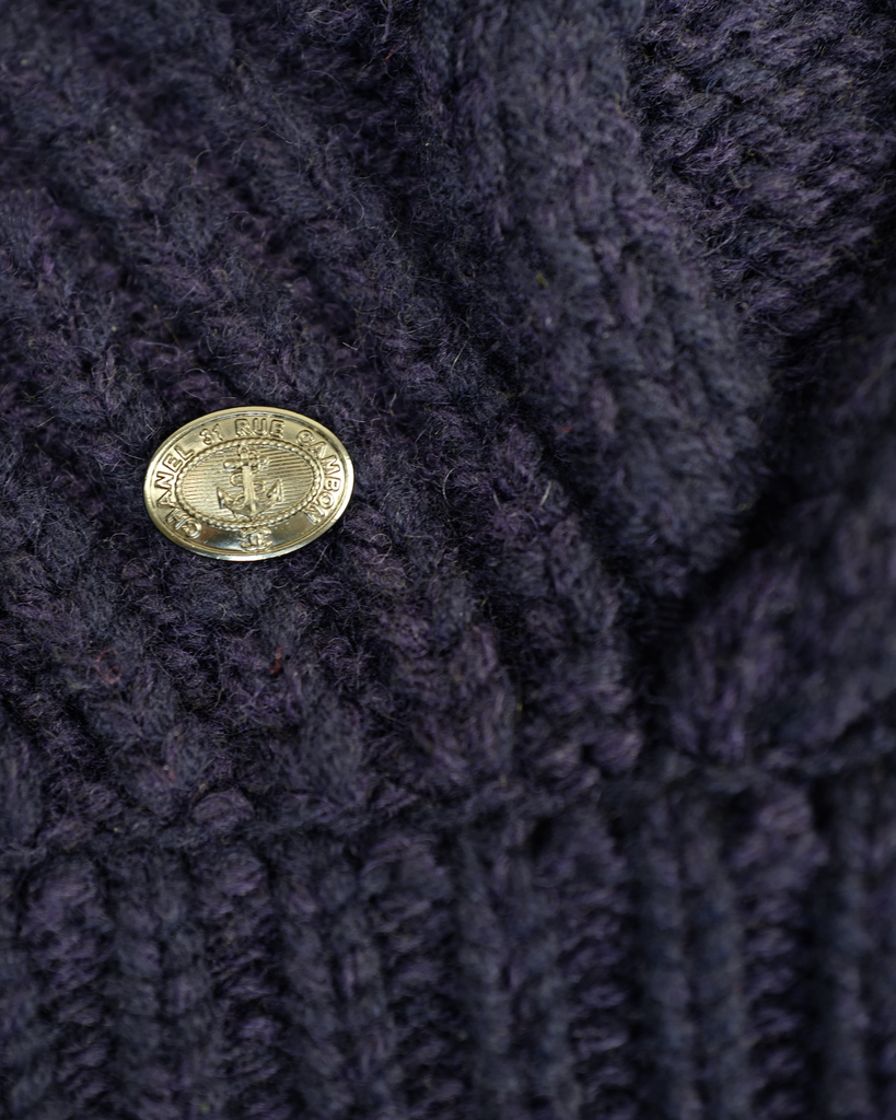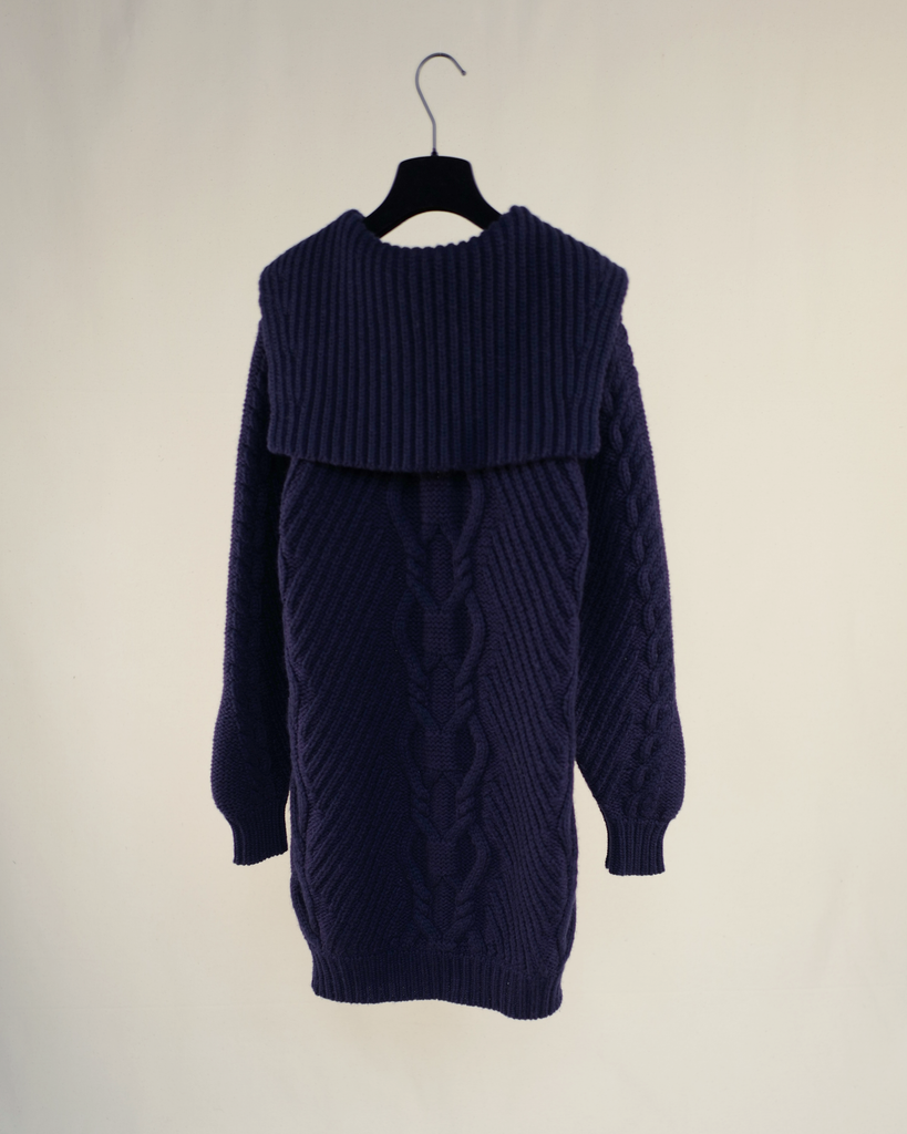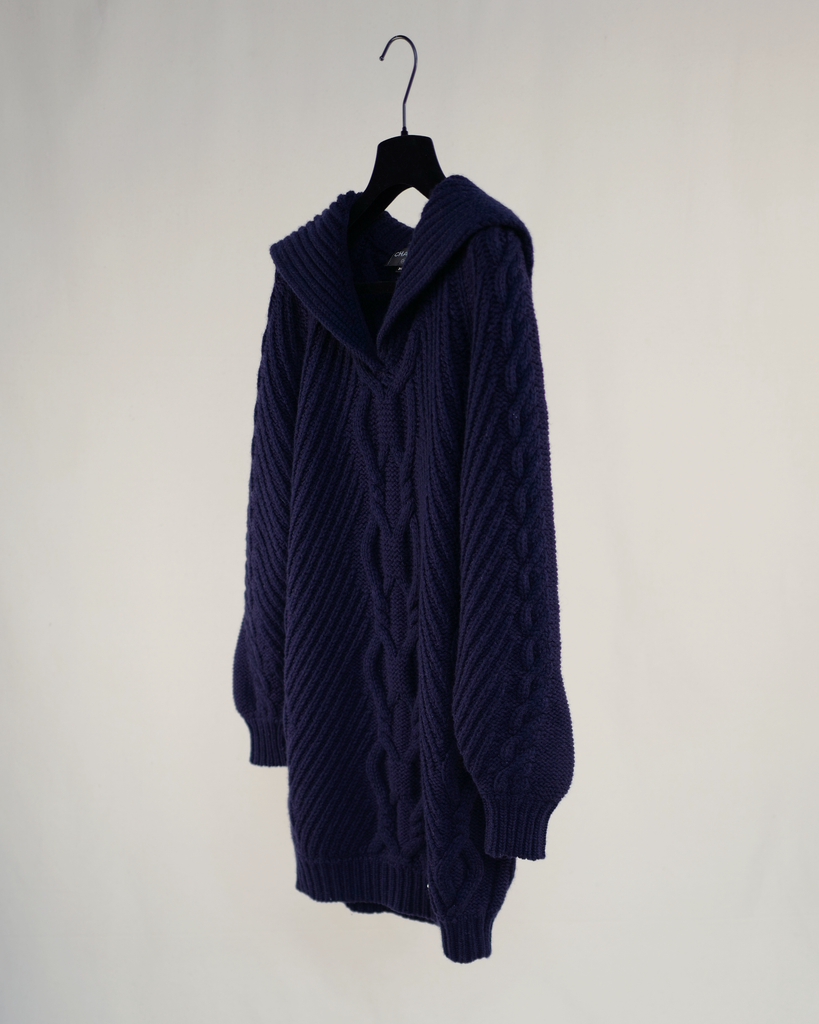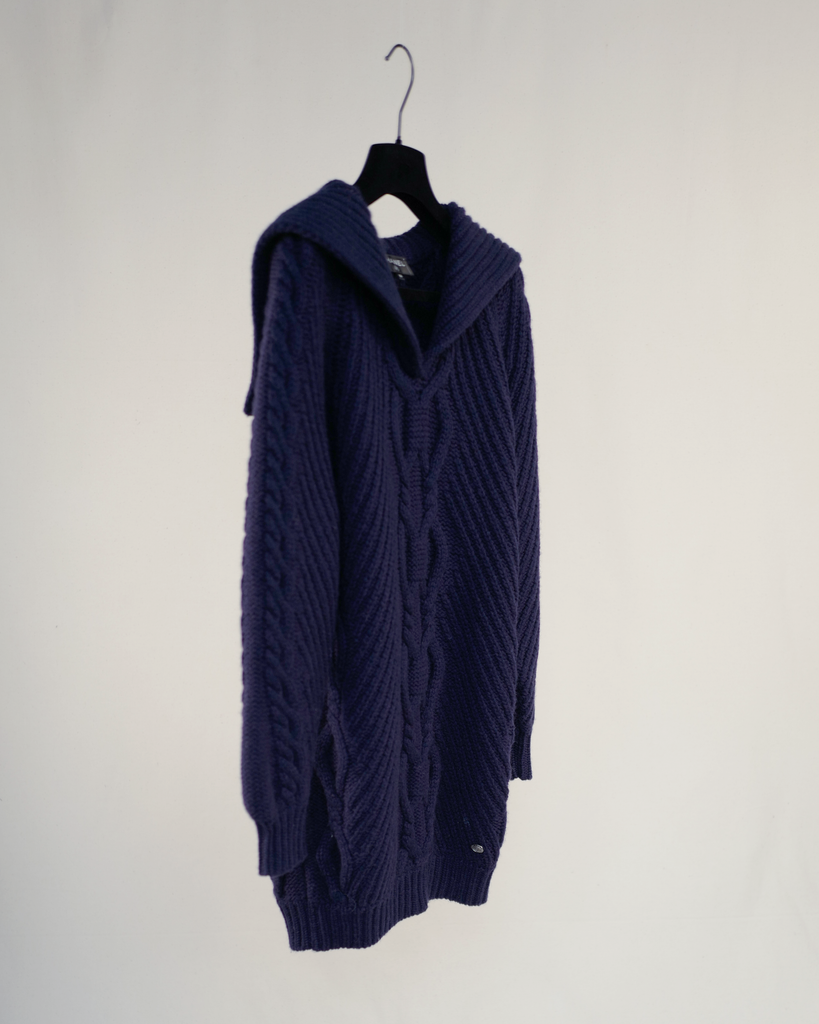 Long heavy runway Chanel knit in navy blue from Karl Lagerfeld's Iconic sailor inspired Metiers D'Art Hamburg Collection pre-fall 2018. Dark blue cashmere wool blend in braided pattern with gunmetal details. The look was presented as number two. Can be worn as a shirt or dress.