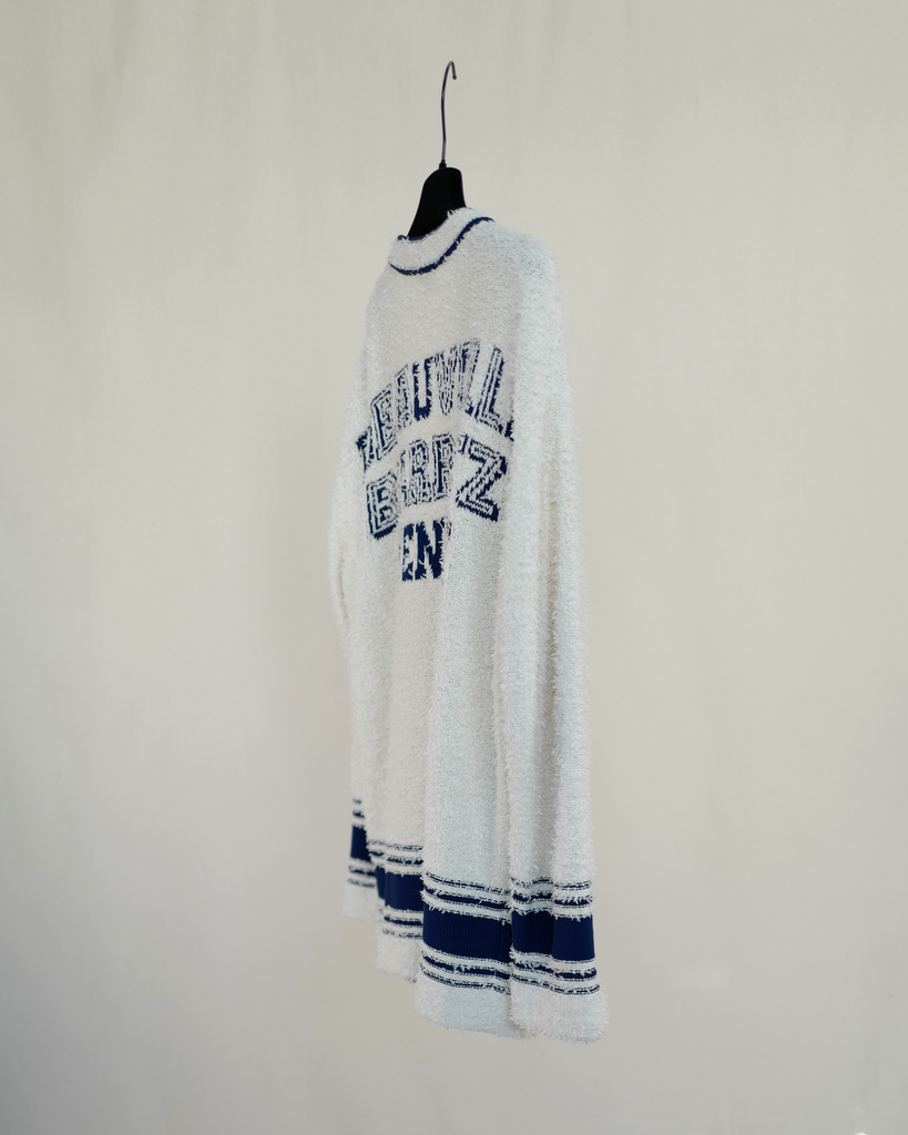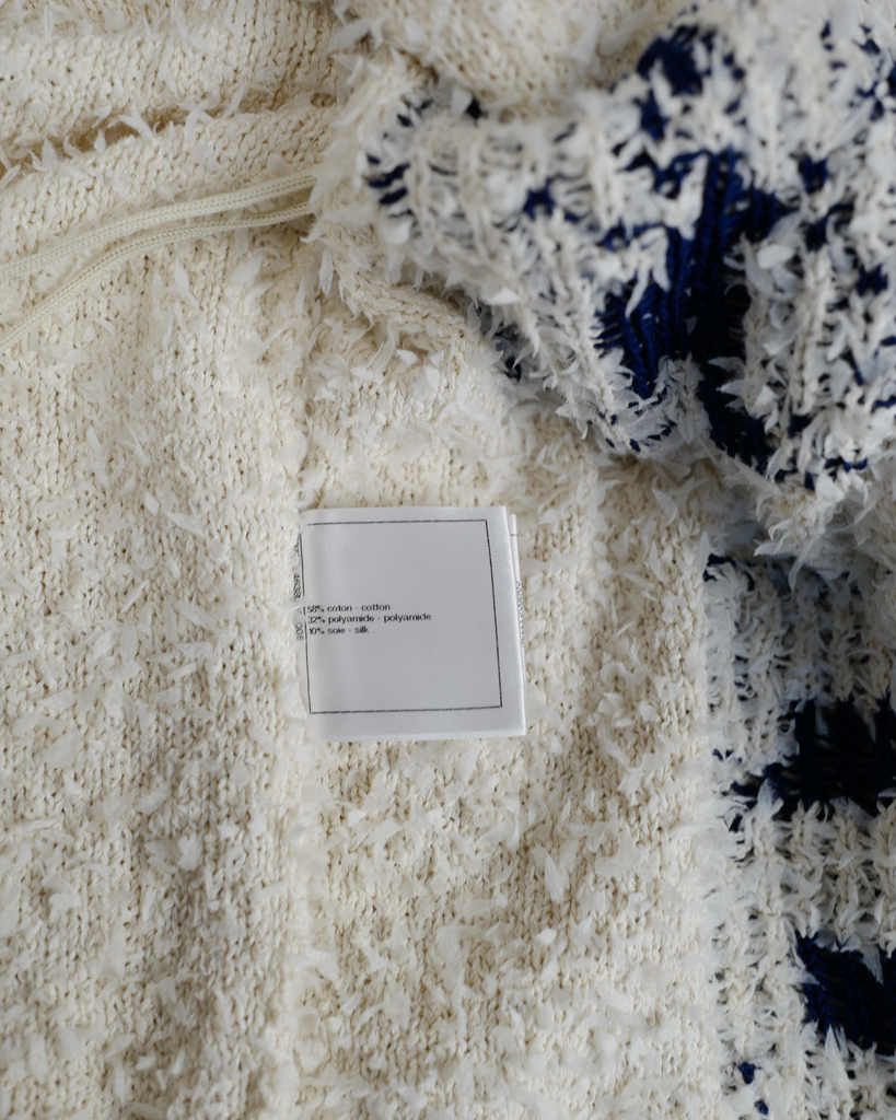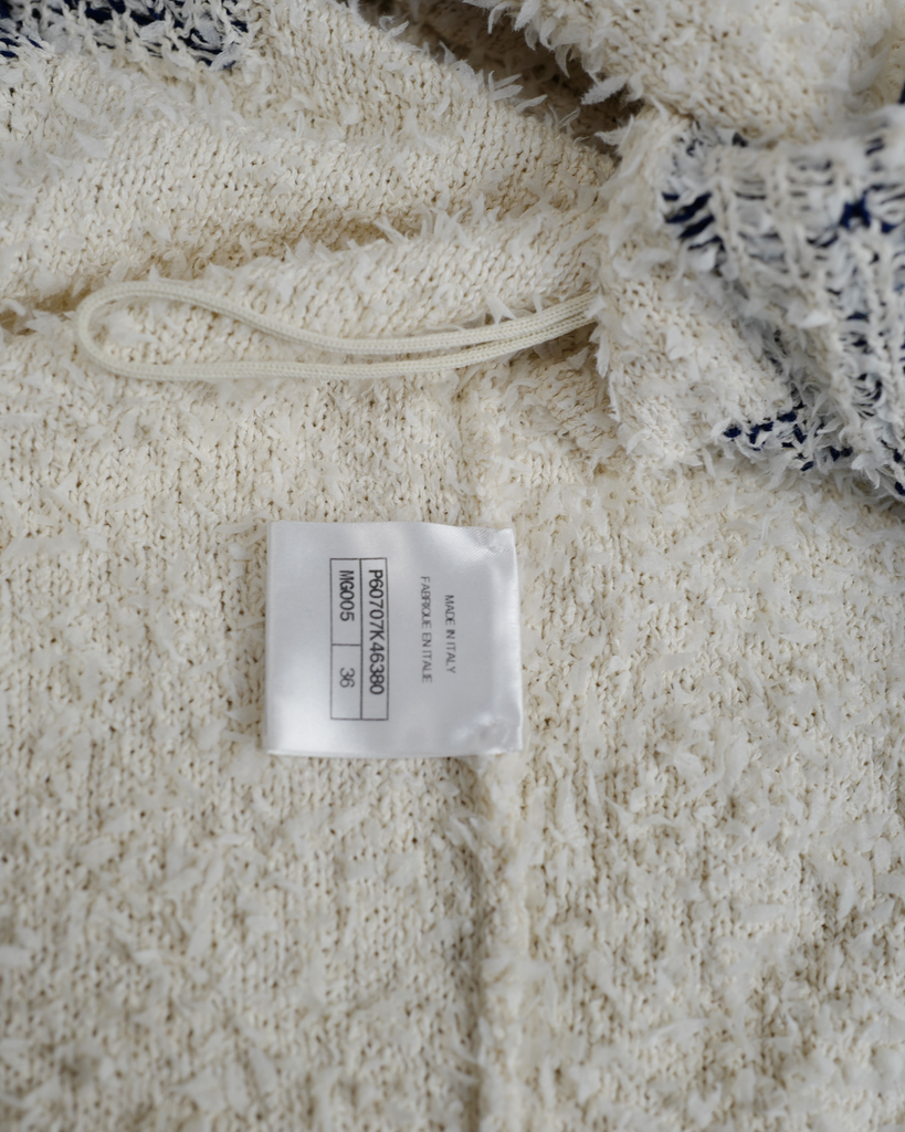 White Chanel cardigan with accent knit details and text in dark blue from pre spring 2019. Closes with four CC logo buttons. Two front pocket closes with CC buttons saying "RUE CAMBON 31". Cotton-Silk blend.