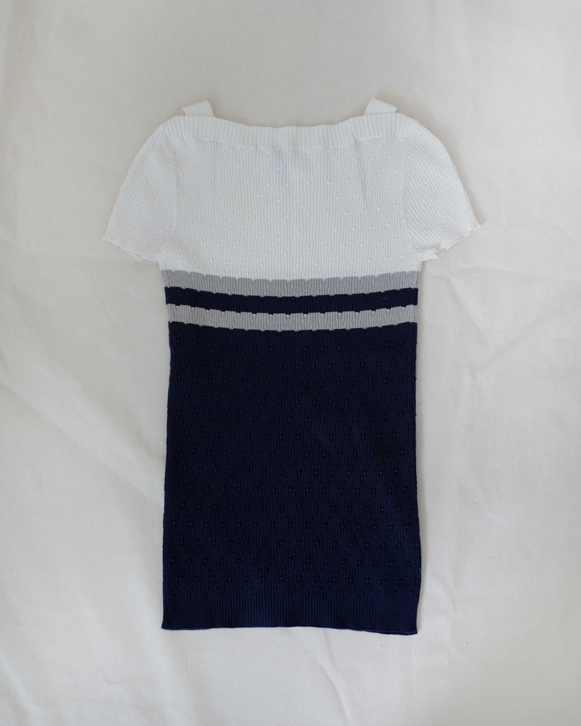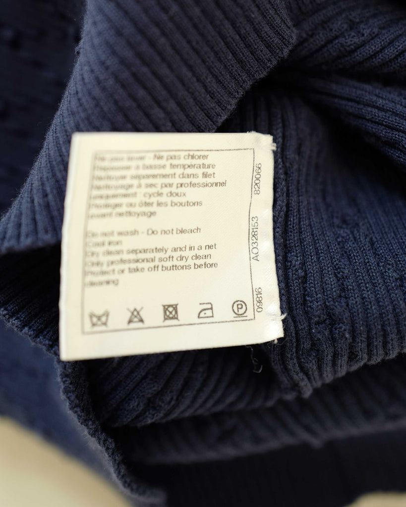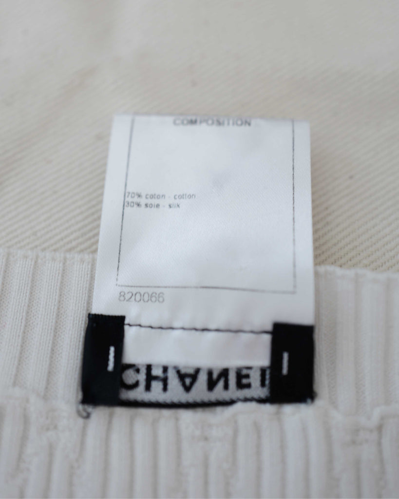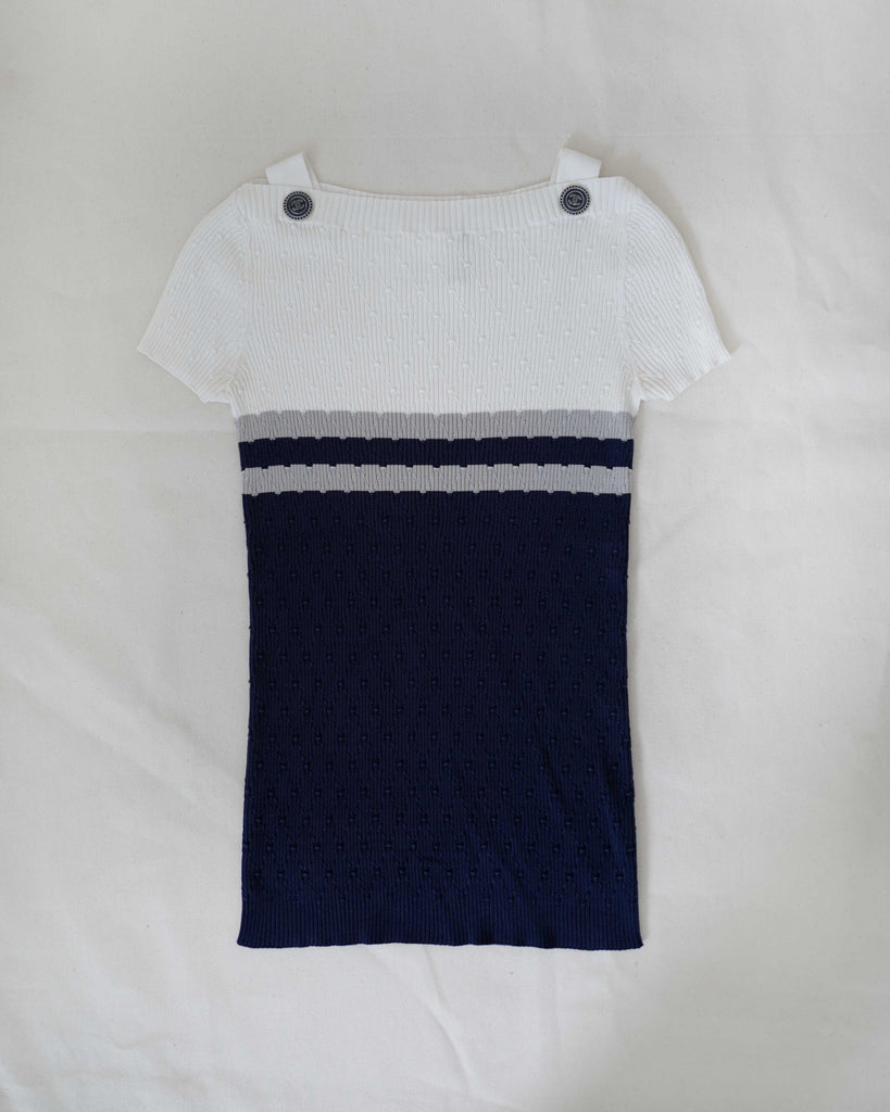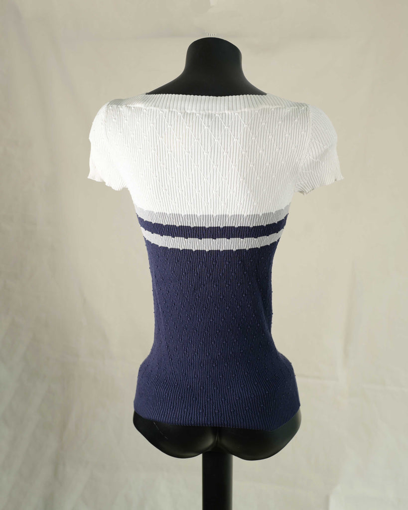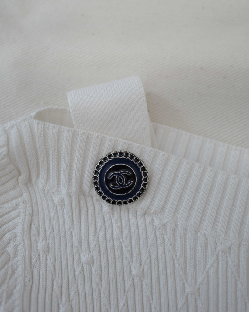 Blue, white and grey advanced knit top with shoulder straps. Diamond patterned knit with a lot of stretch. blue and silver CC logo buttons on front. Slightest yellow staining in armpit, not visible when worn and arms down.