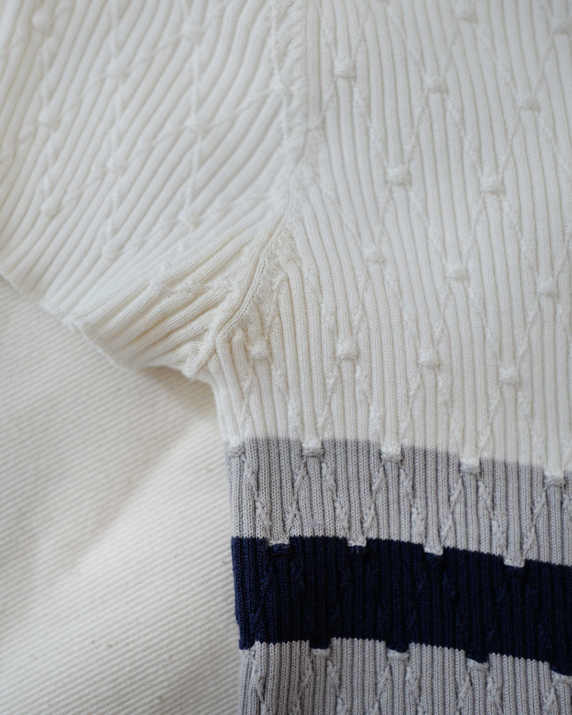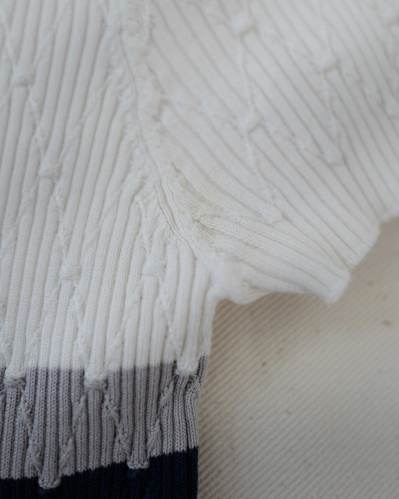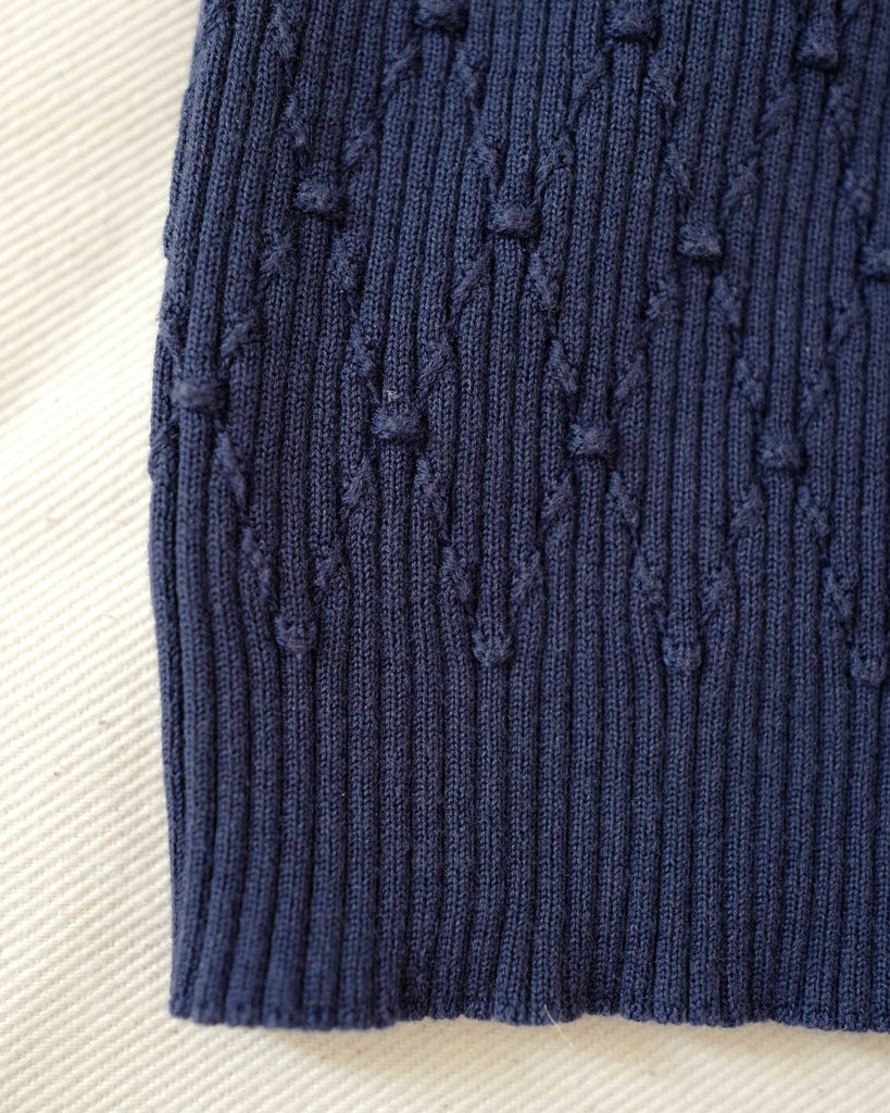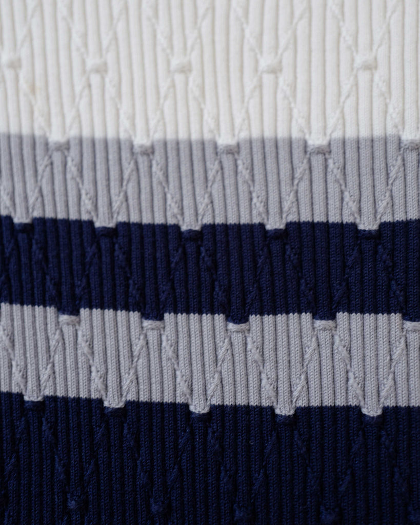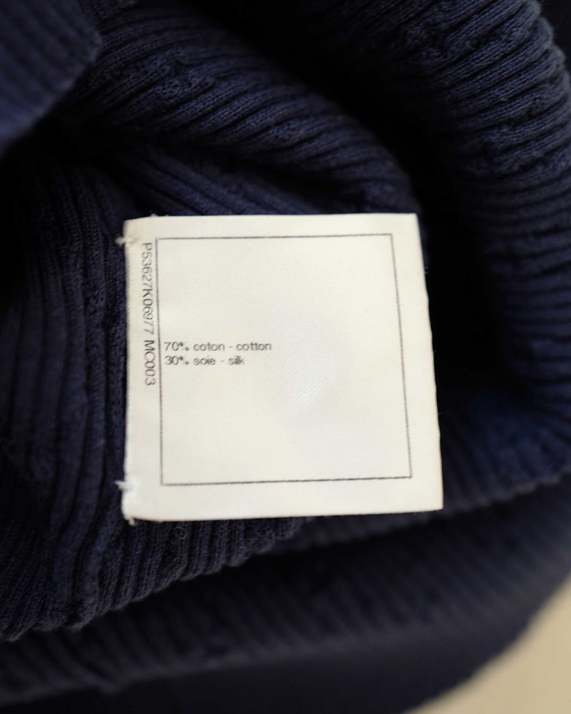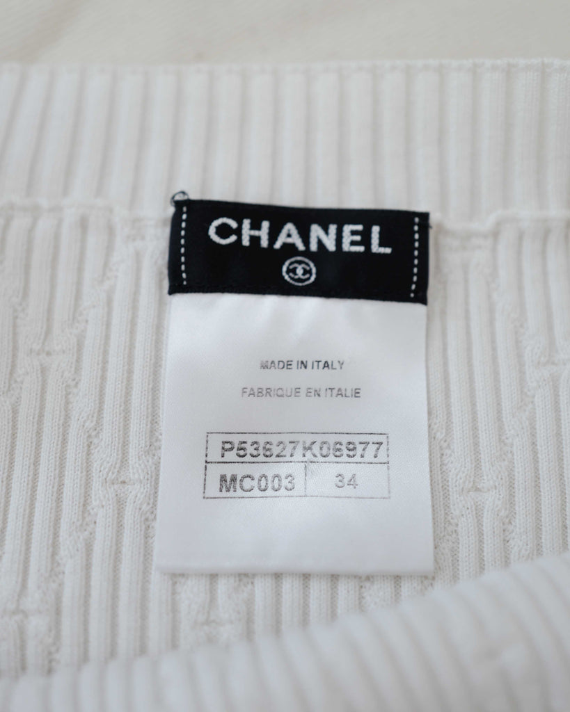 Blue, white and grey advanced knit top with shoulder straps. Diamond patterned knit with a lot of stretch. blue and silver CC logo buttons on front. Slightest yellow staining in armpit, not visible when worn and arms down.