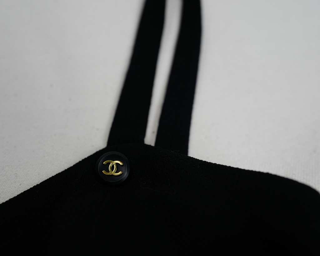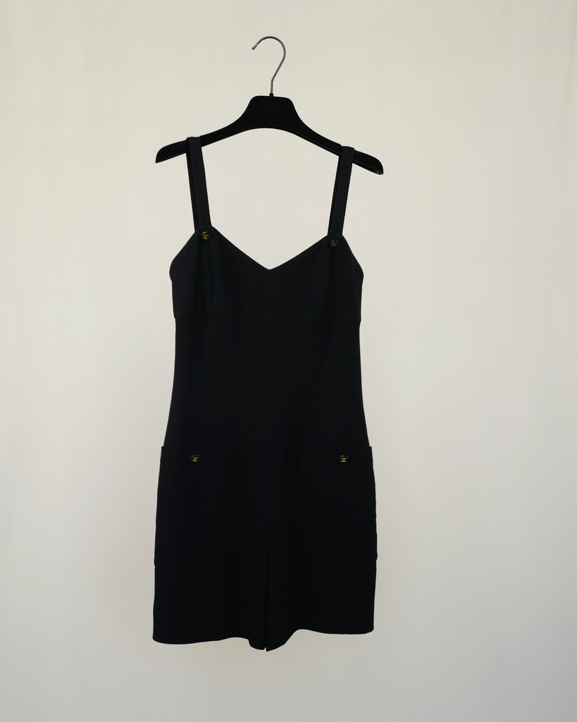 Black 90s Chanel knitted jumpsuit/playsuit/romper. Gold CC buttoned logo on pockets and straps in front. Slight V shaped collar for feminine fit. Spaghetti straps with open back. Closes in back with delicate zipper and dress-hooks. Outer fabric + silk lining.