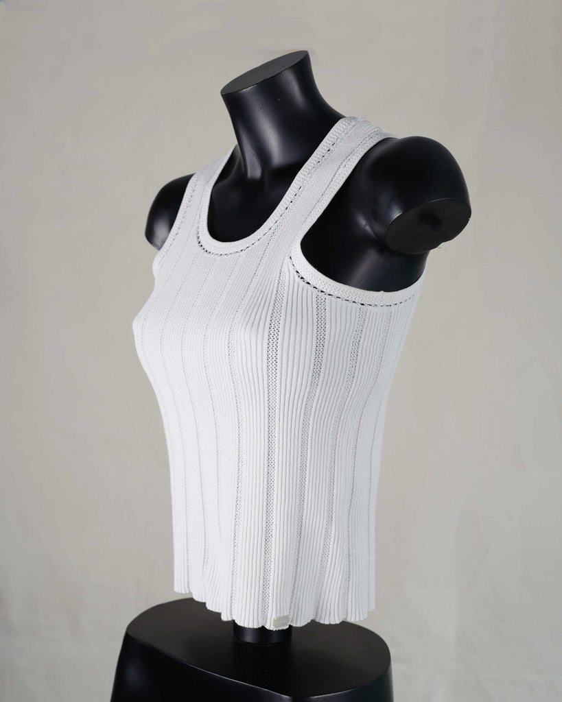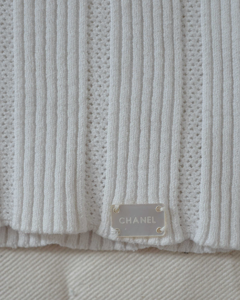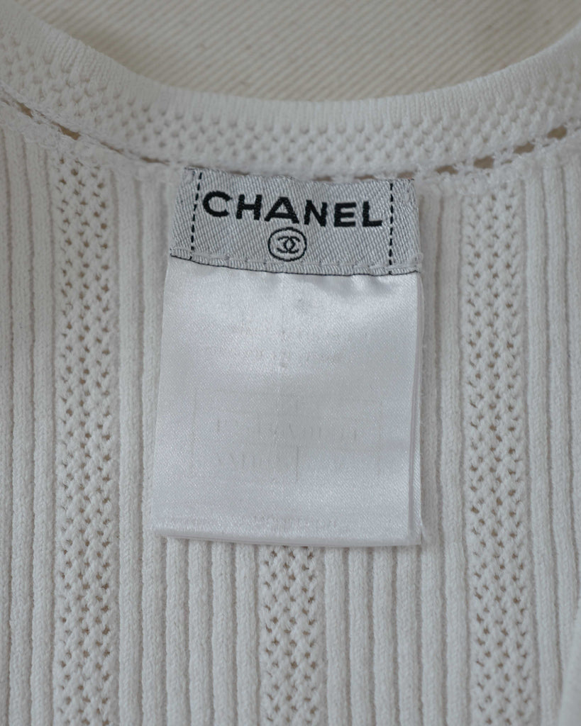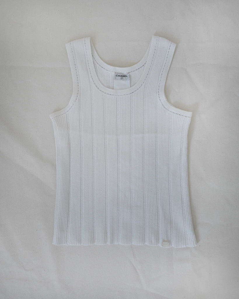 White Chanel lace knitted tank top. Fine detailing at neckline and hemmed. Detailed ribbing. Pearl CHANEL logo at left front. Faded tags but believed to be from 1994.