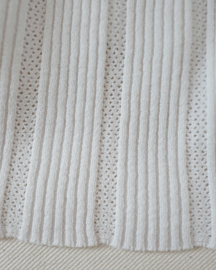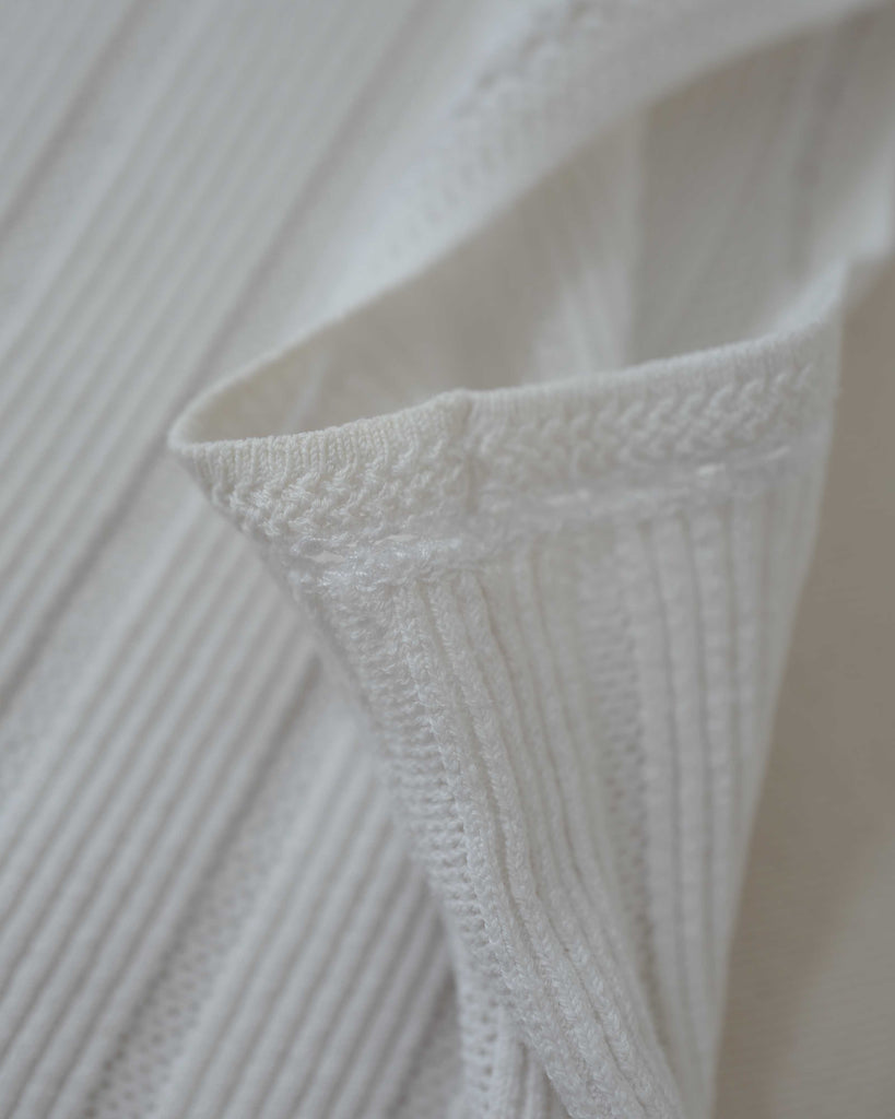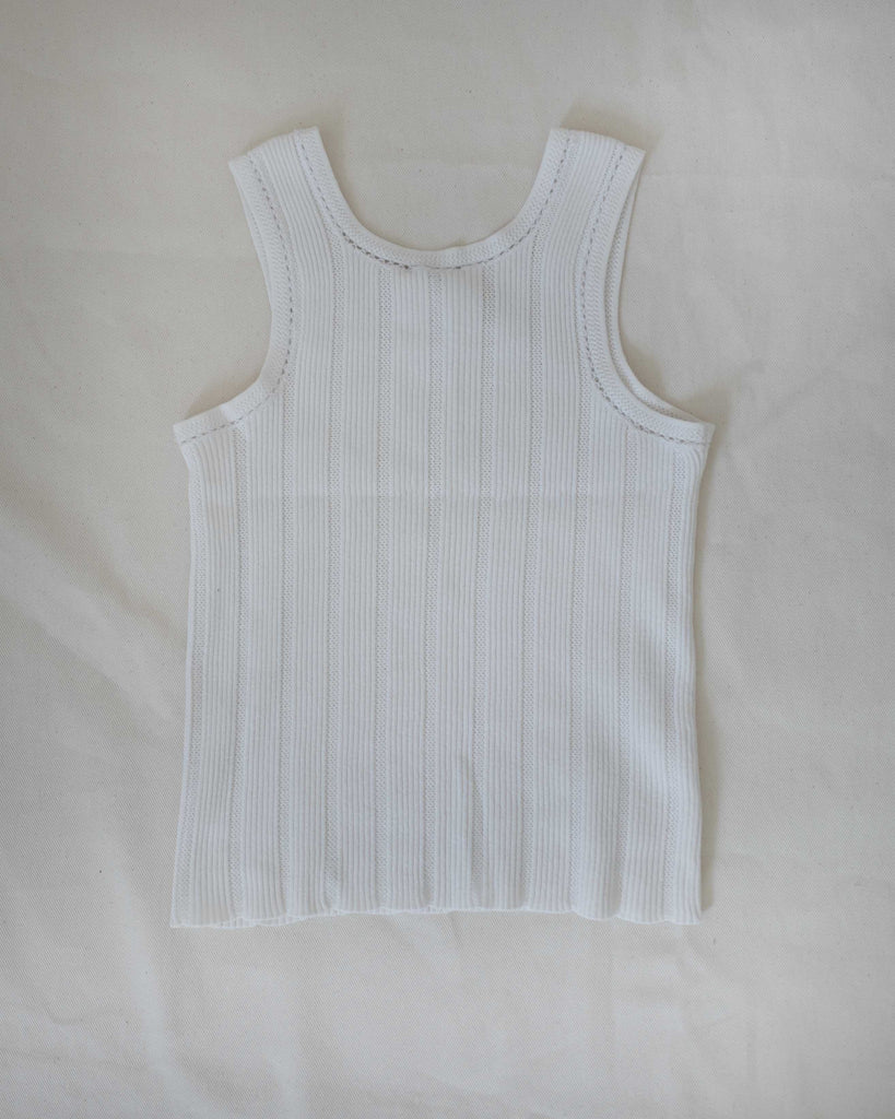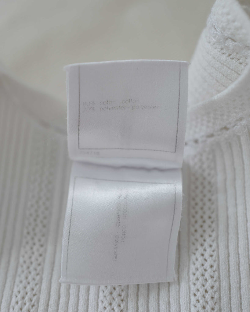 White Chanel lace knitted tank top. Fine detailing at neckline and hemmed. Detailed ribbing. Pearl CHANEL logo at left front. Faded tags but believed to be from 1994.