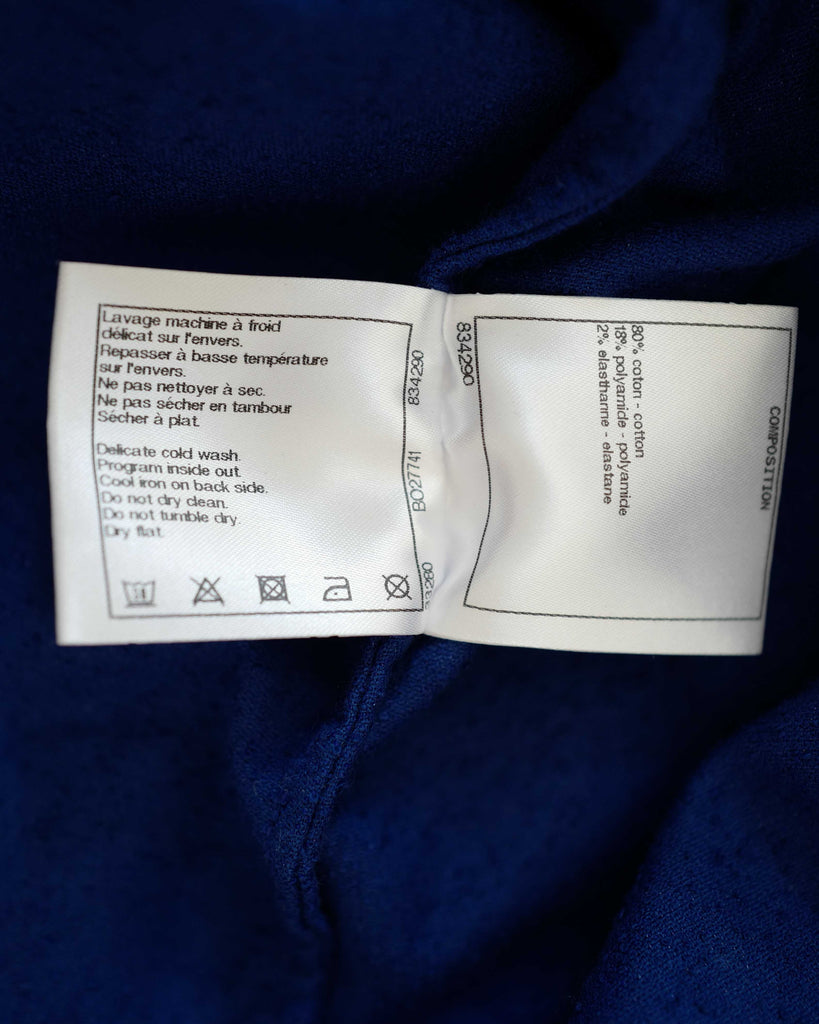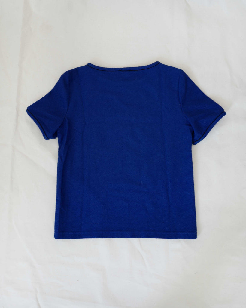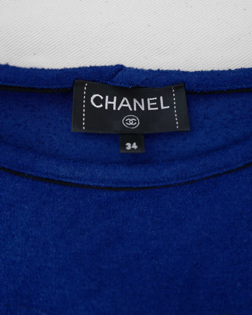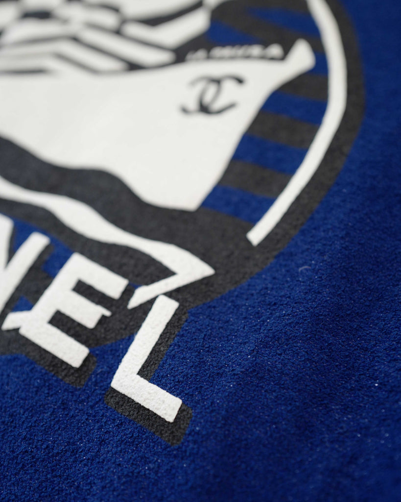 Dark blue Chanel La Pausa t-shirt with glitter tricot. Short sleeves, normal length. Heavy black and white ship print.
