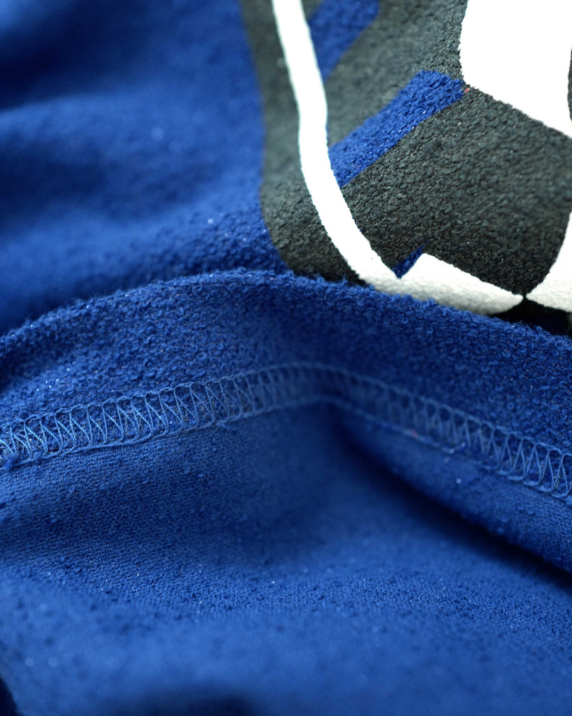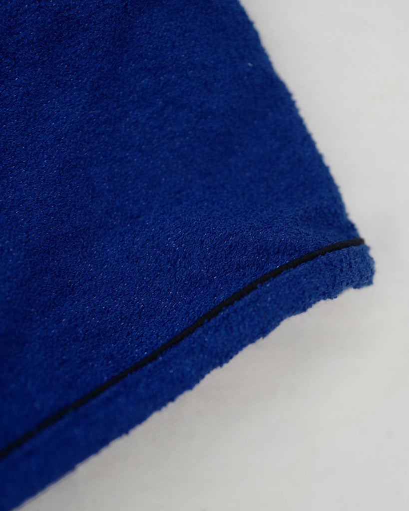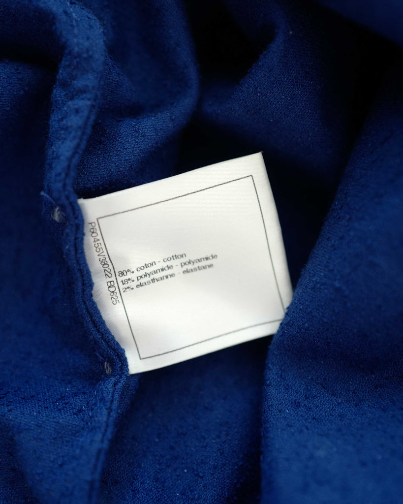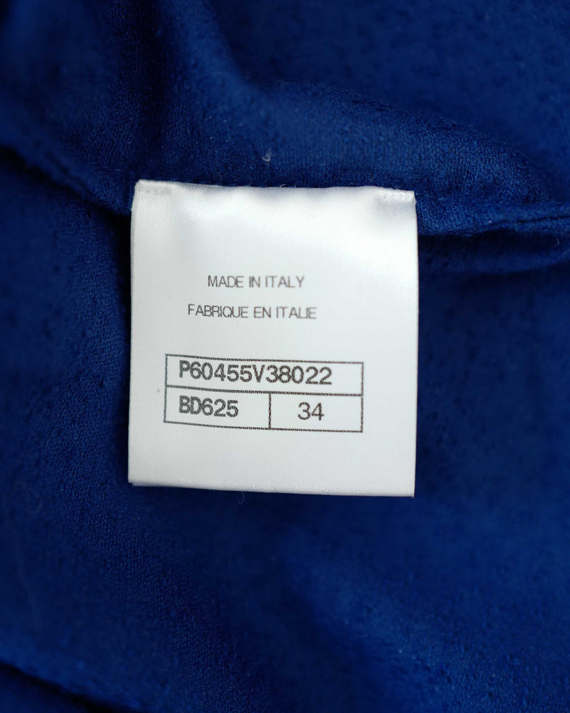 Dark blue Chanel La Pausa t-shirt with glitter tricot. Short sleeves, normal length. Heavy black and white ship print.