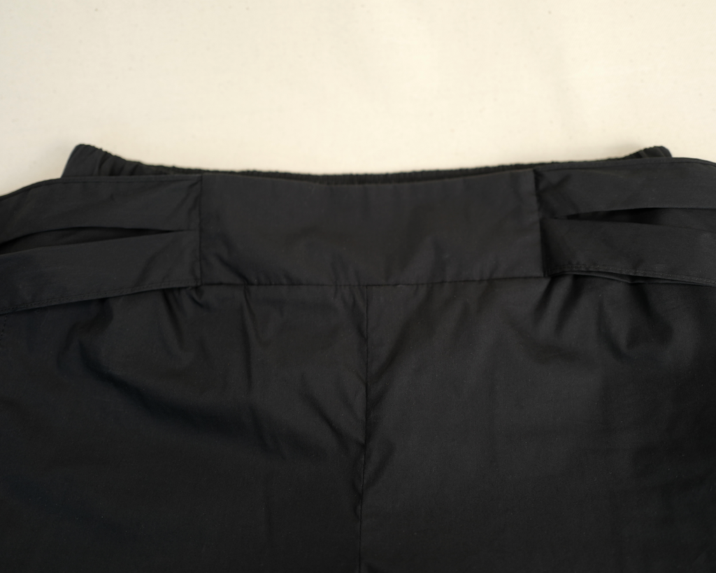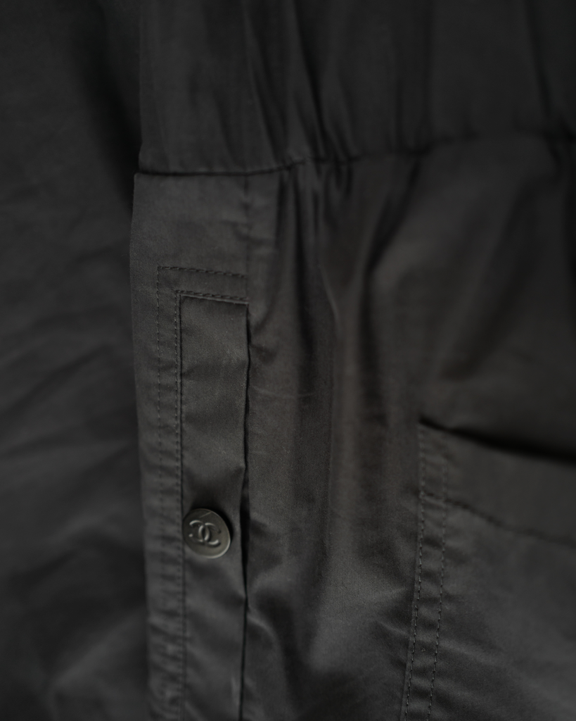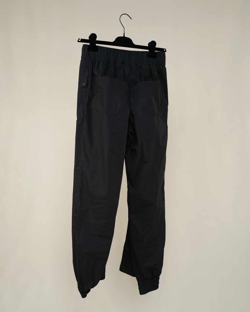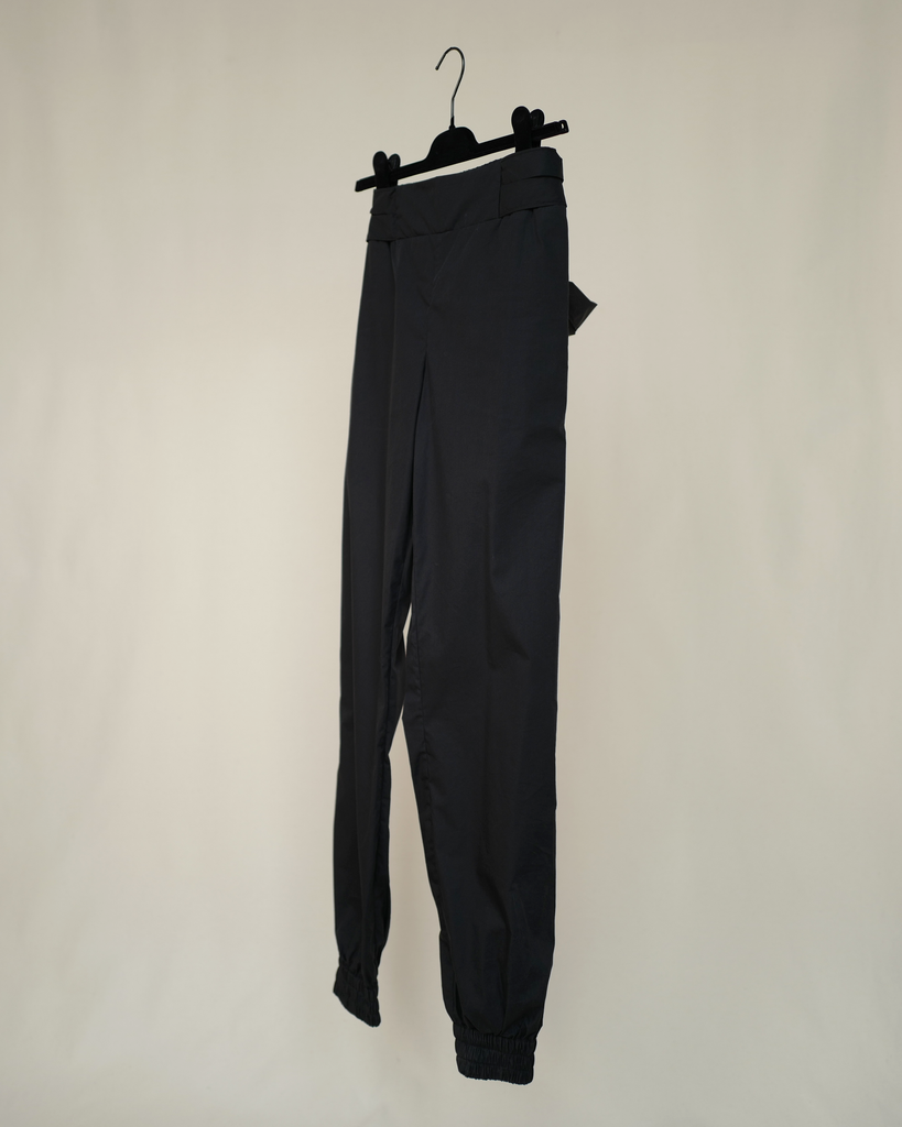 Black Chanel trousers in thin sweatpants model. Long tie to be tied for different stylings. Cuffs at ankles. Two side pockets closes with CC-logo push buttons. Two Back pockets. Black/off. black colour. Soft touch, thin fabric.