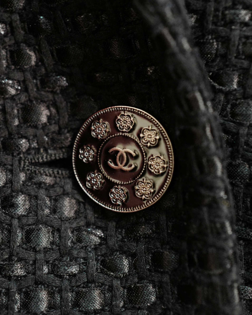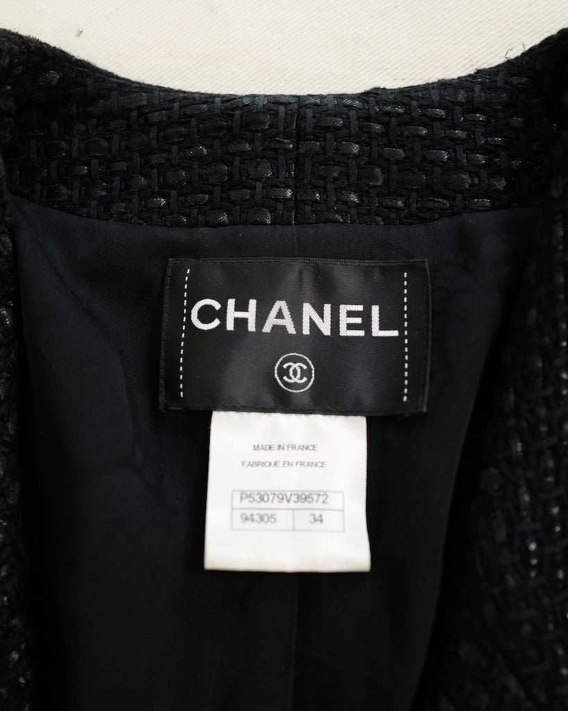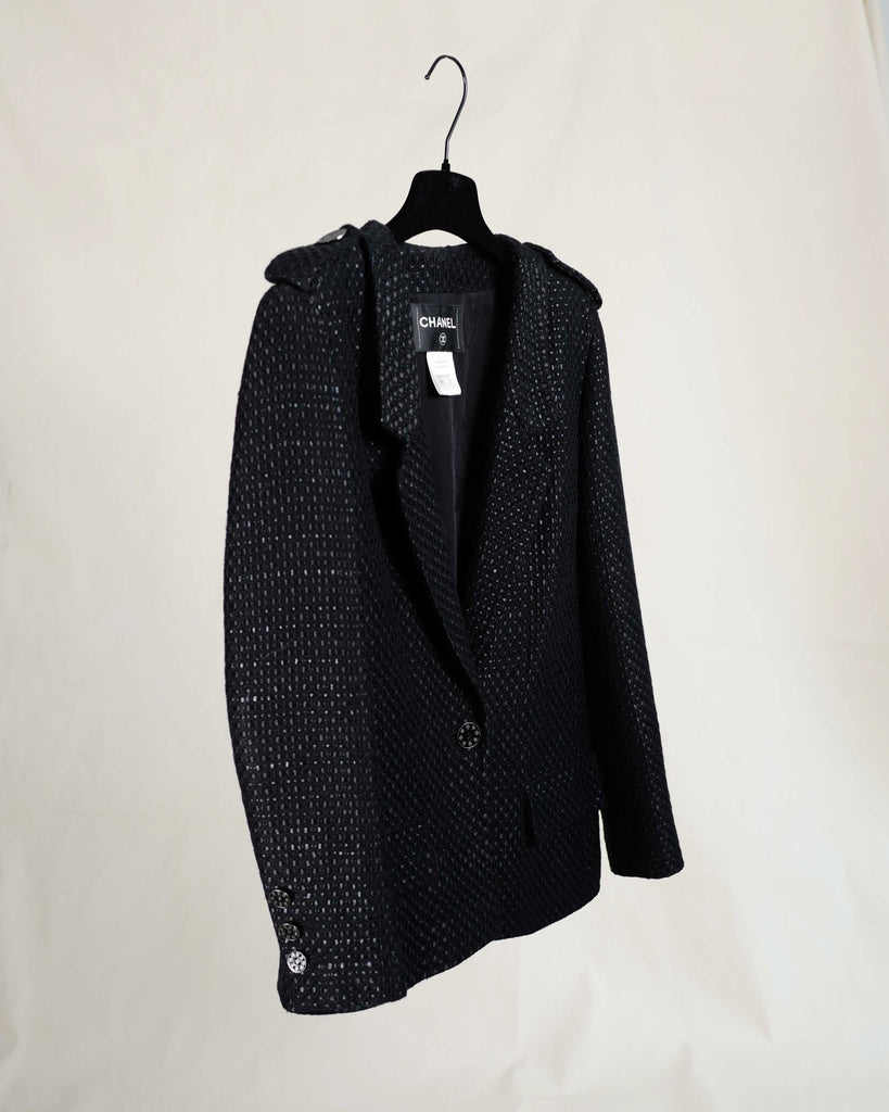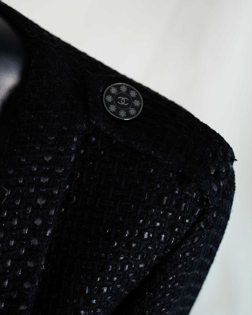 Black glossy tweed jacket from Chanel Resort 2016 presented in Seoul. Single breasted, one button, cut collar model. Black matt and glossy tweed with gunmetal details, including rare gun metal weight chain.
