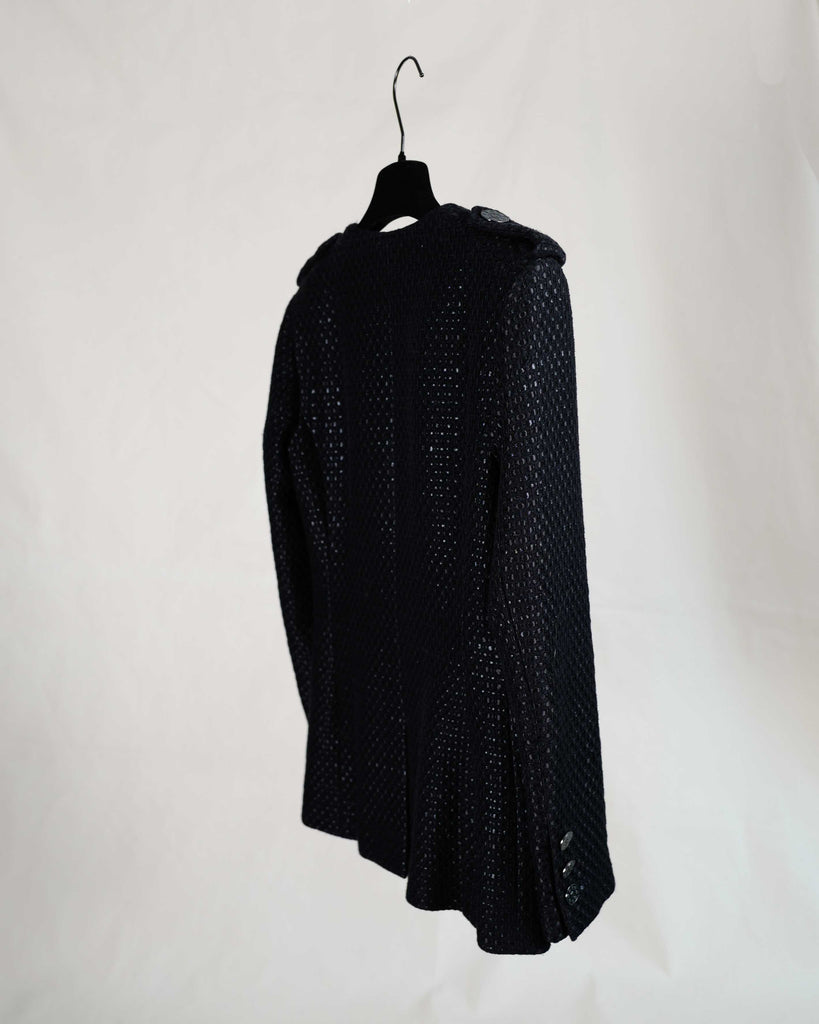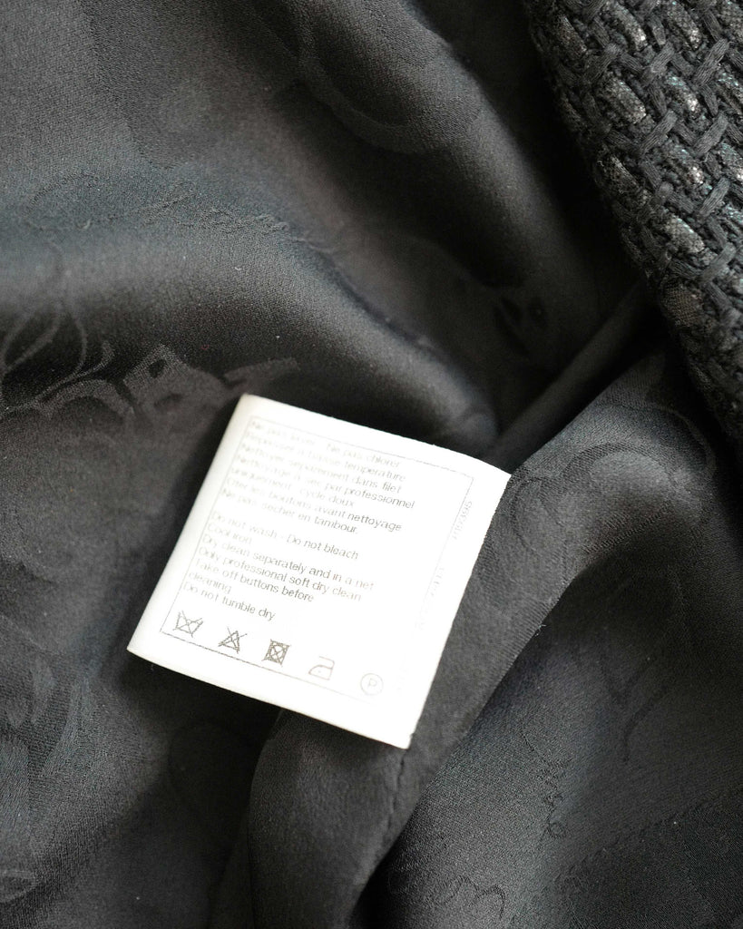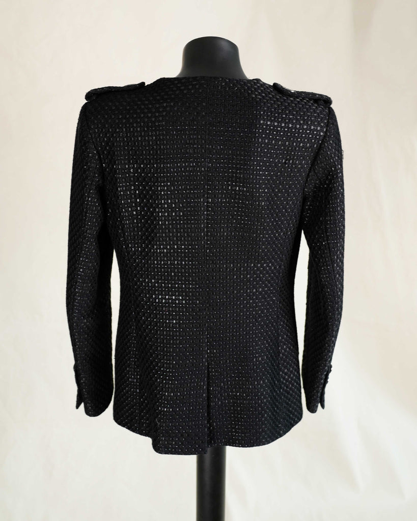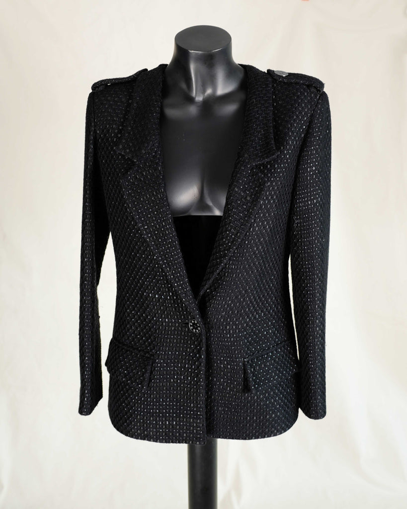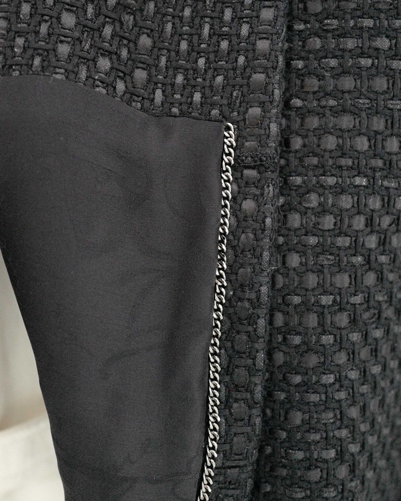 Black glossy tweed jacket from Chanel Resort 2016 presented in Seoul. Single breasted, one button, cut collar model. Black matt and glossy tweed with gunmetal details, including rare gun metal weight chain.