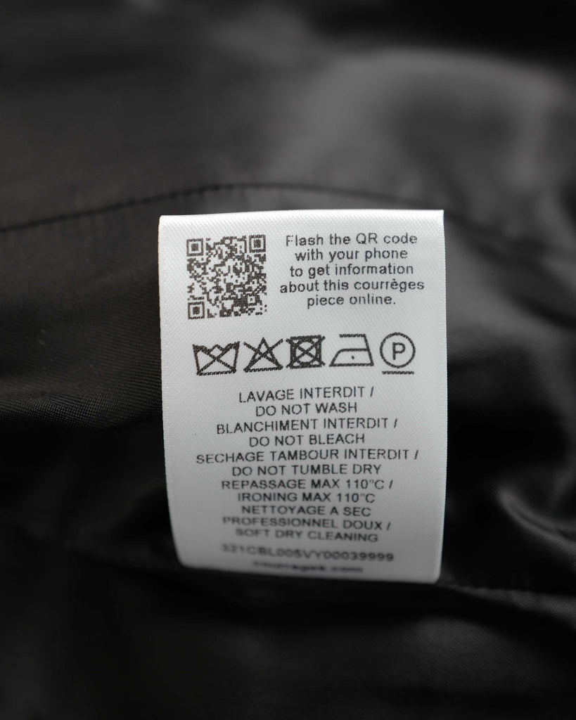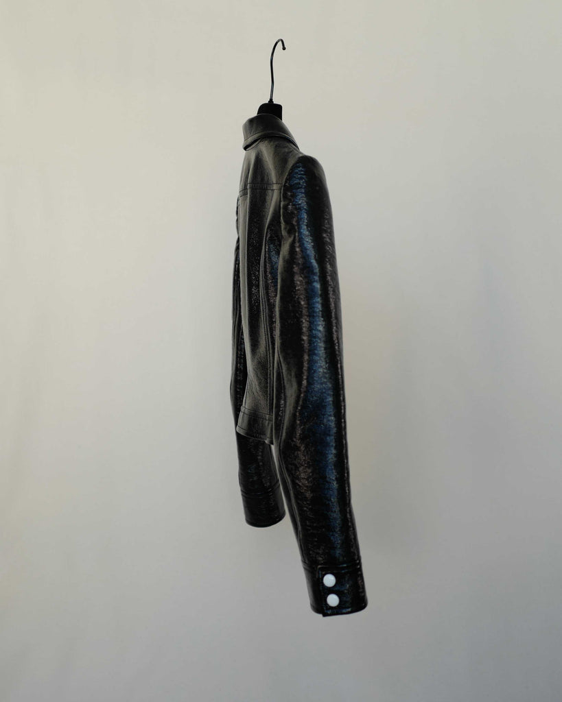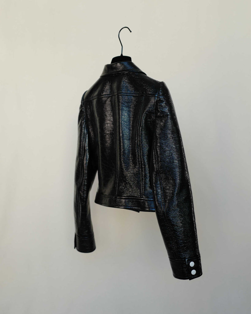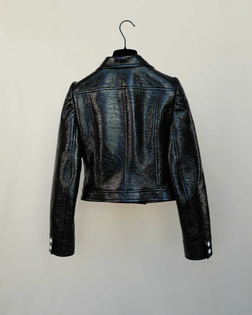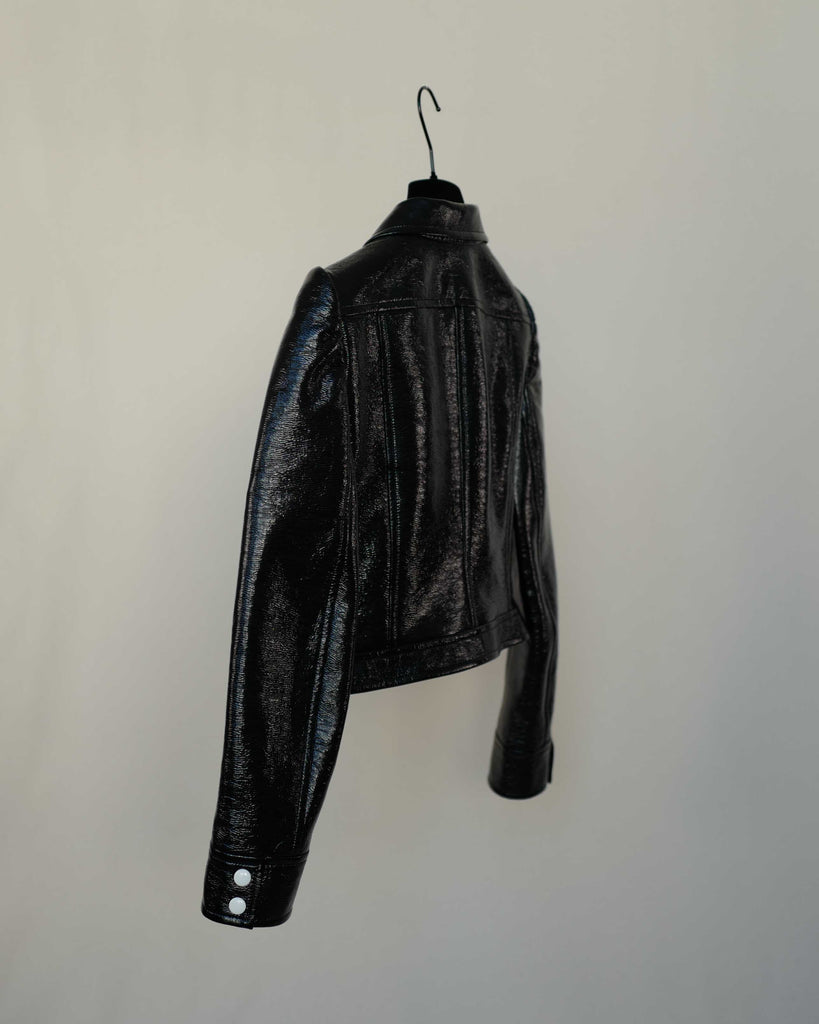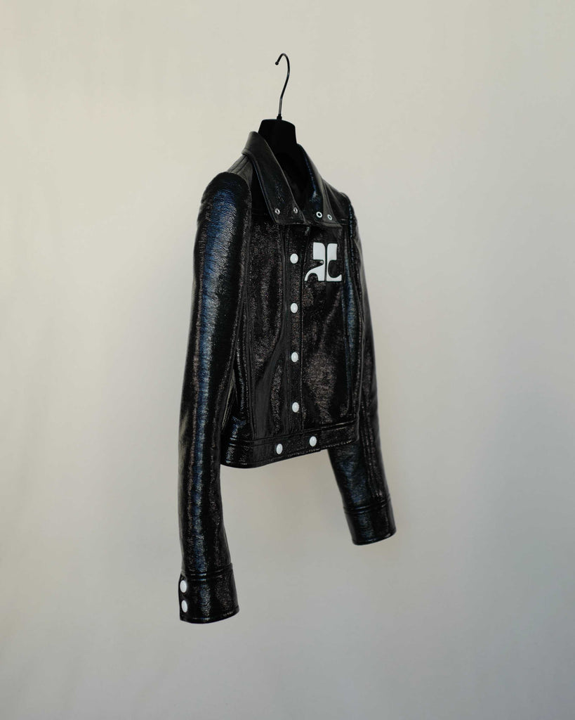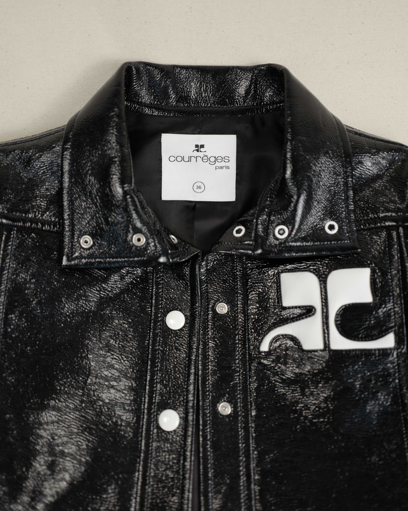 Black Courrèges reedition vinyl jacket. White contrasting push buttons. White logo on left chest.