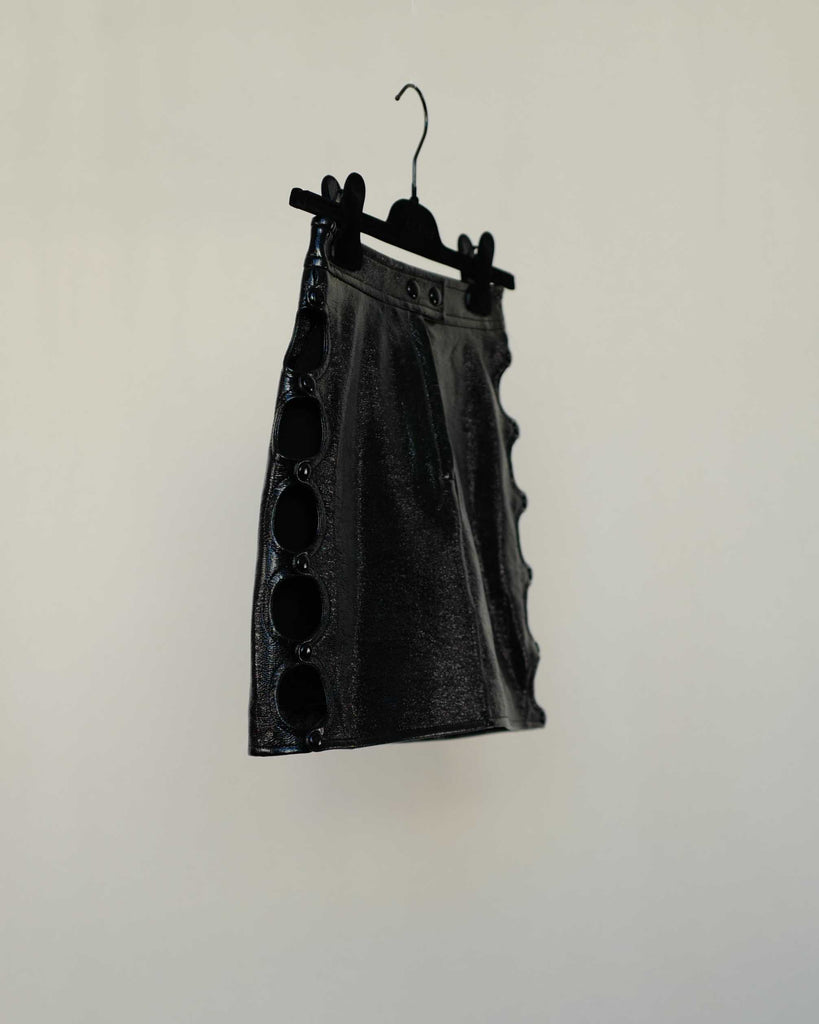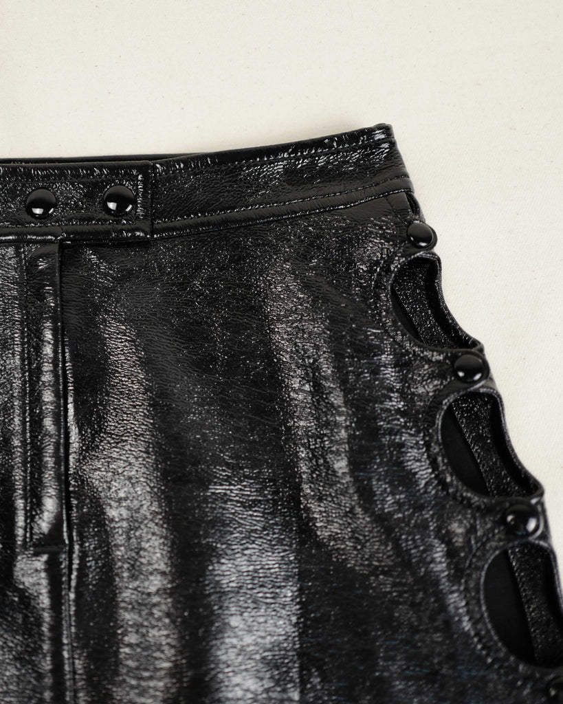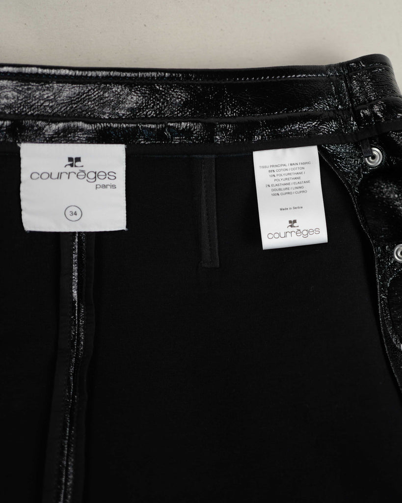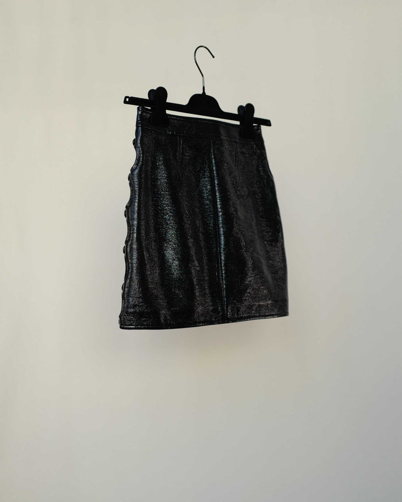 Black Courrèges vinyl skirt cut out button detail on sides. Black glossy push buttons.