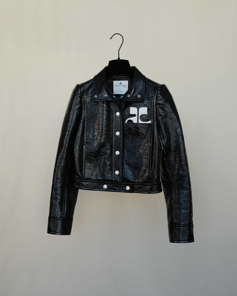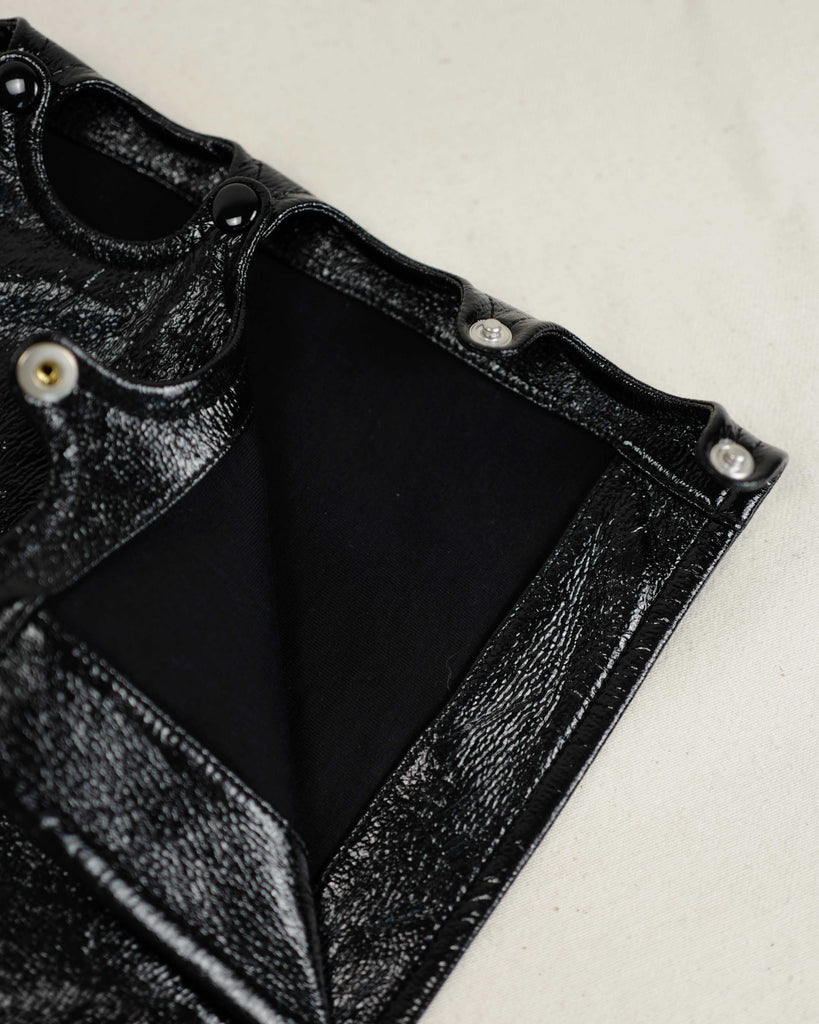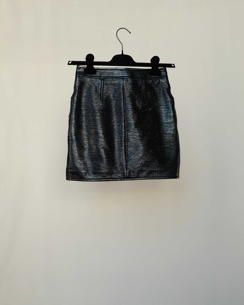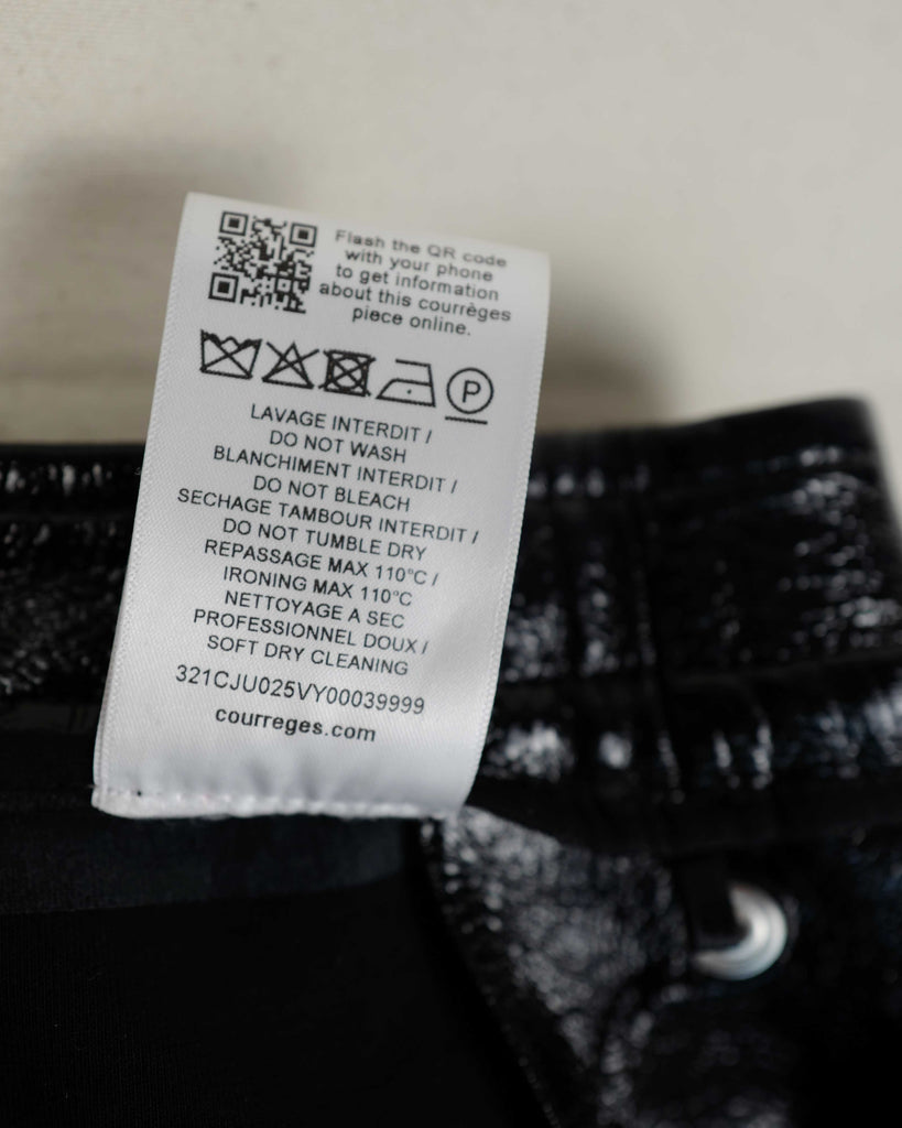 Black Courrèges vinyl skirt cut out button detail on sides. Black glossy push buttons.