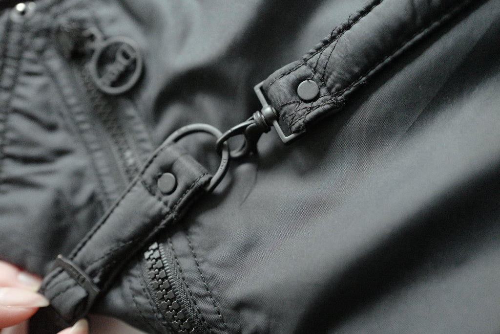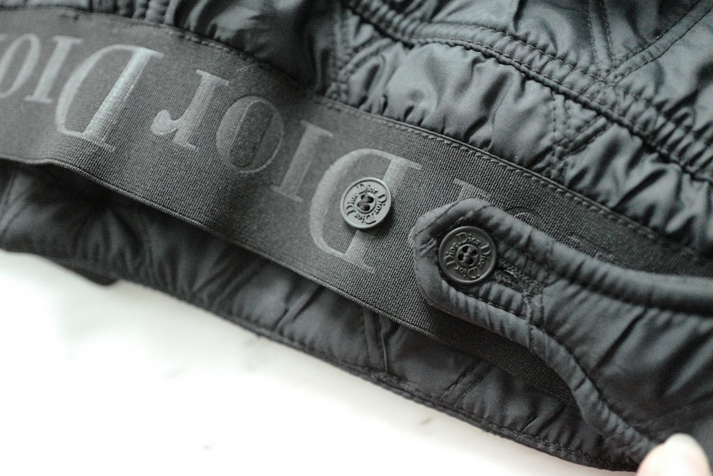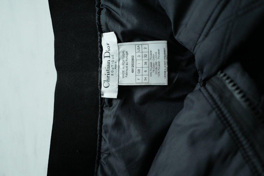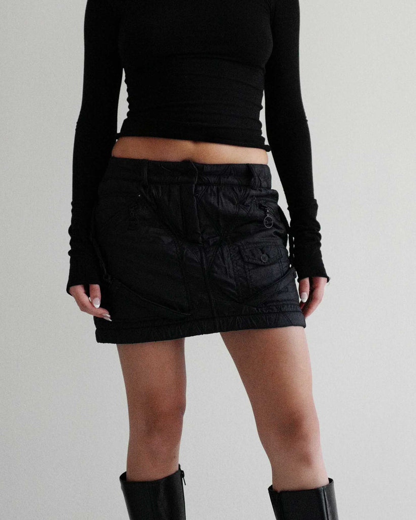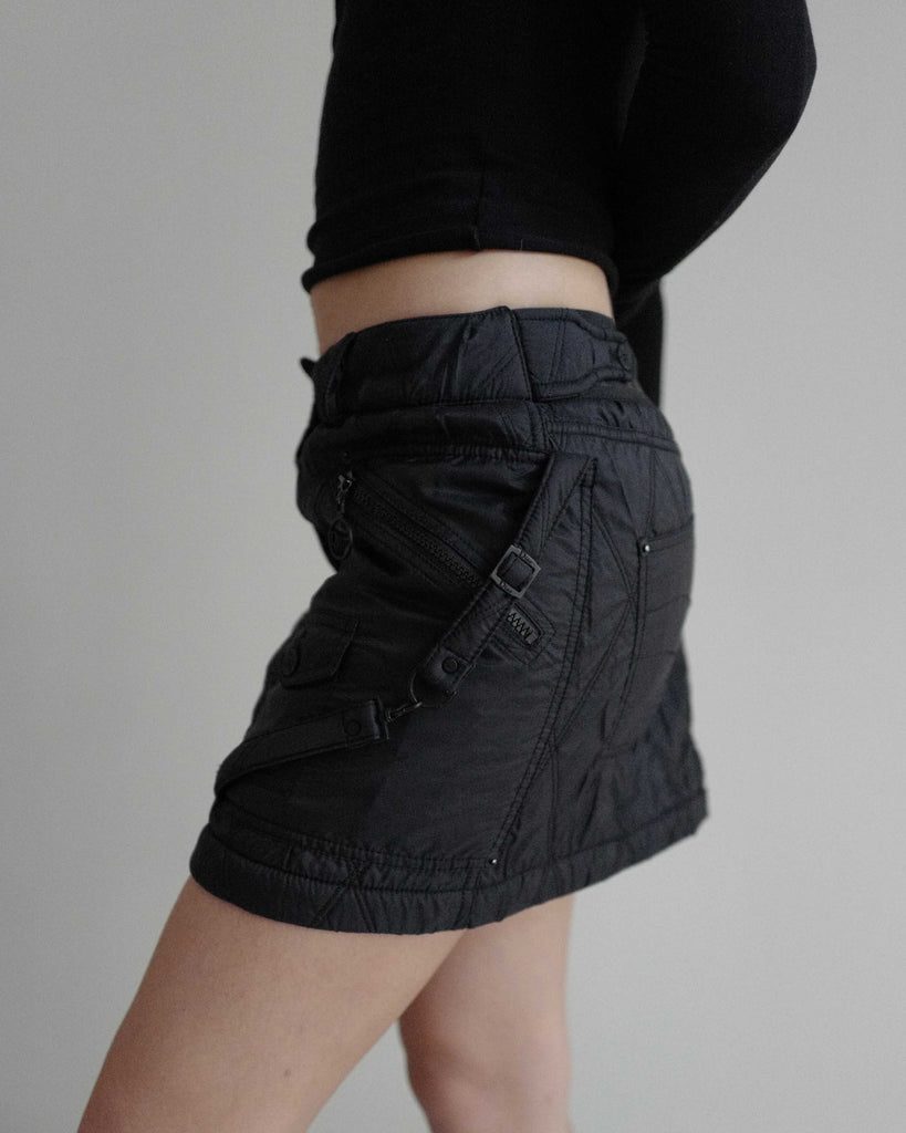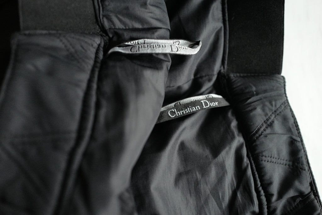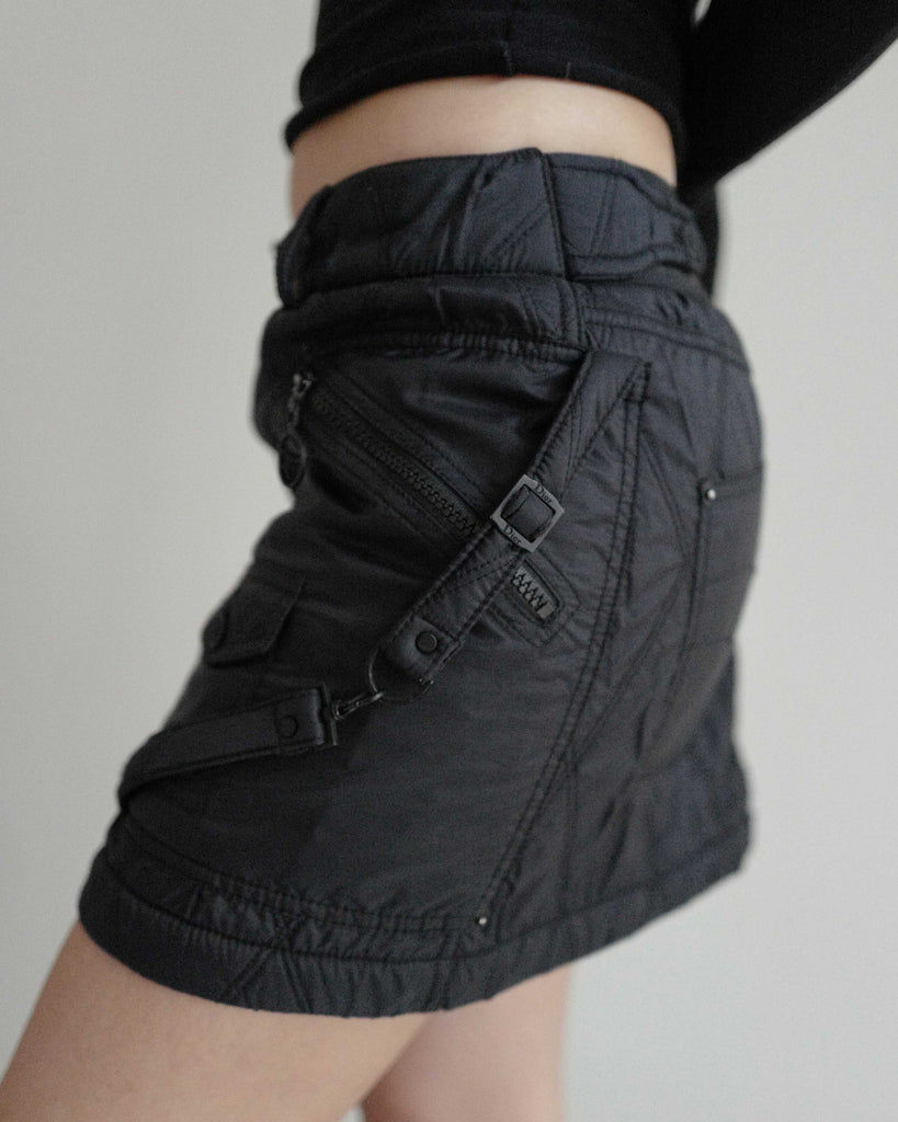 Black padded Dior skirt with technical accessories and straps. Fleece lined, super cozy. Black on black nylon details, adjustable waist. Front pocketsockets with zippers.