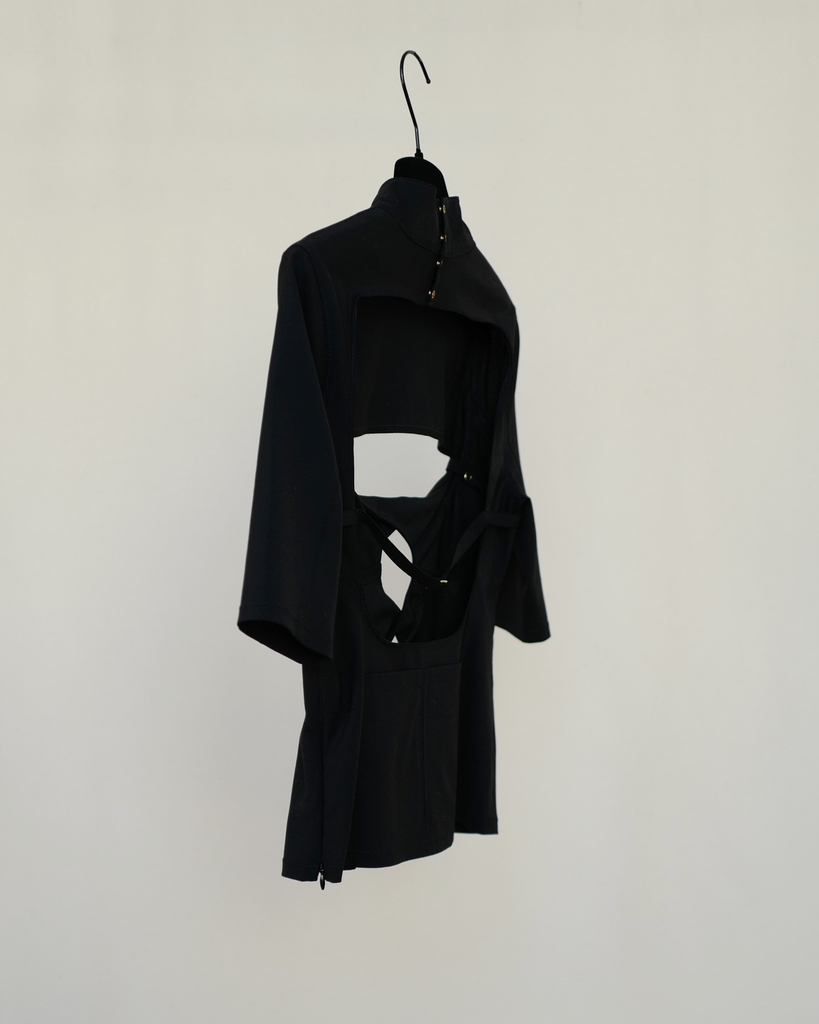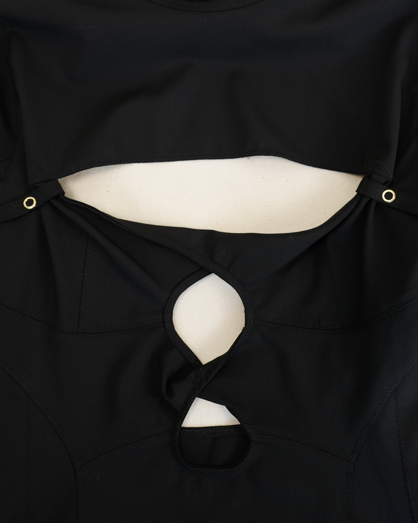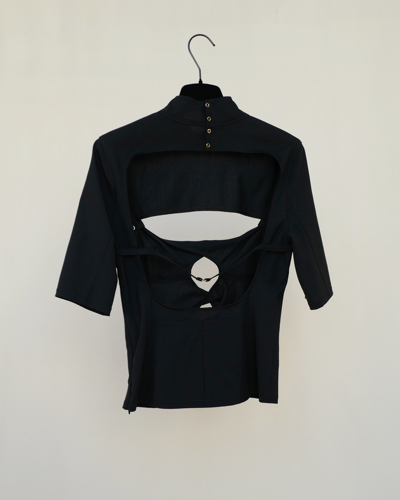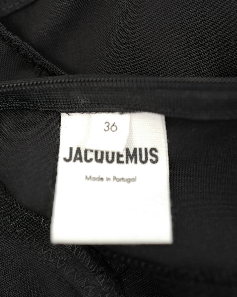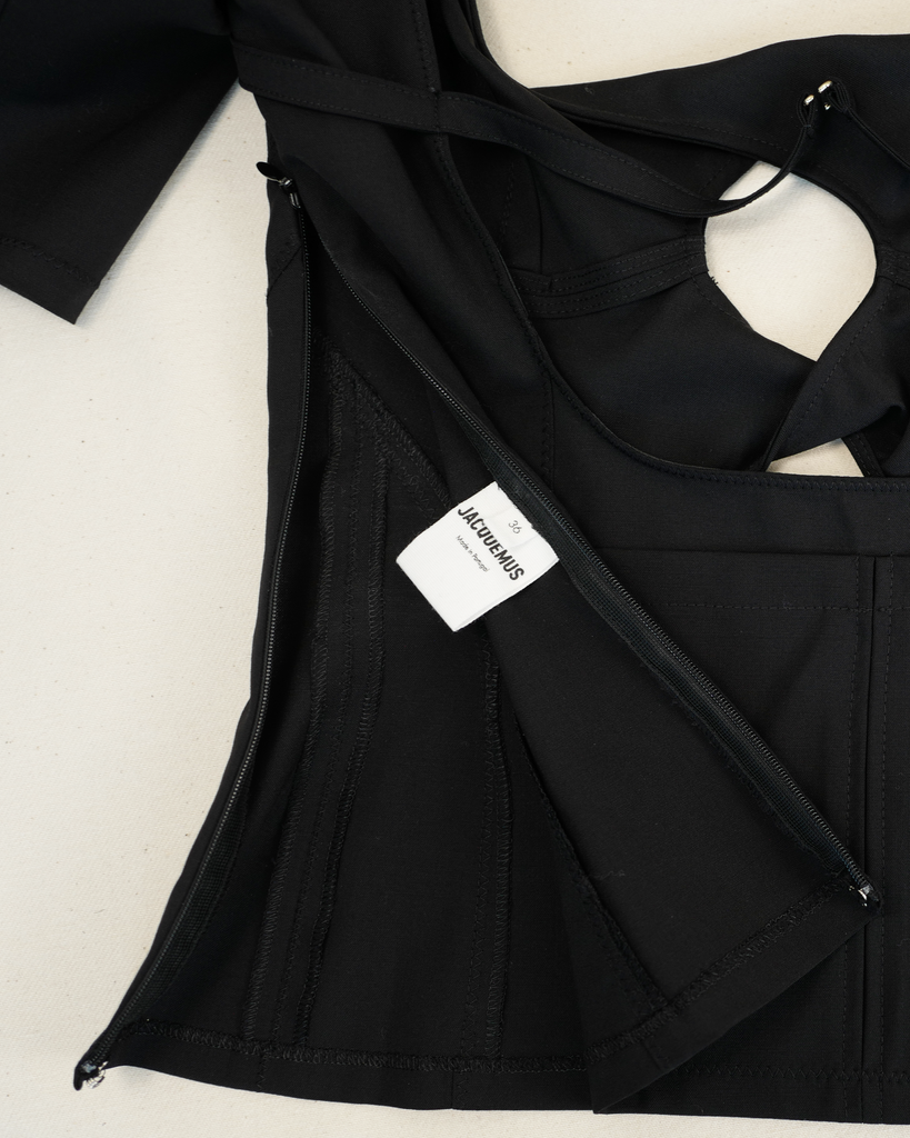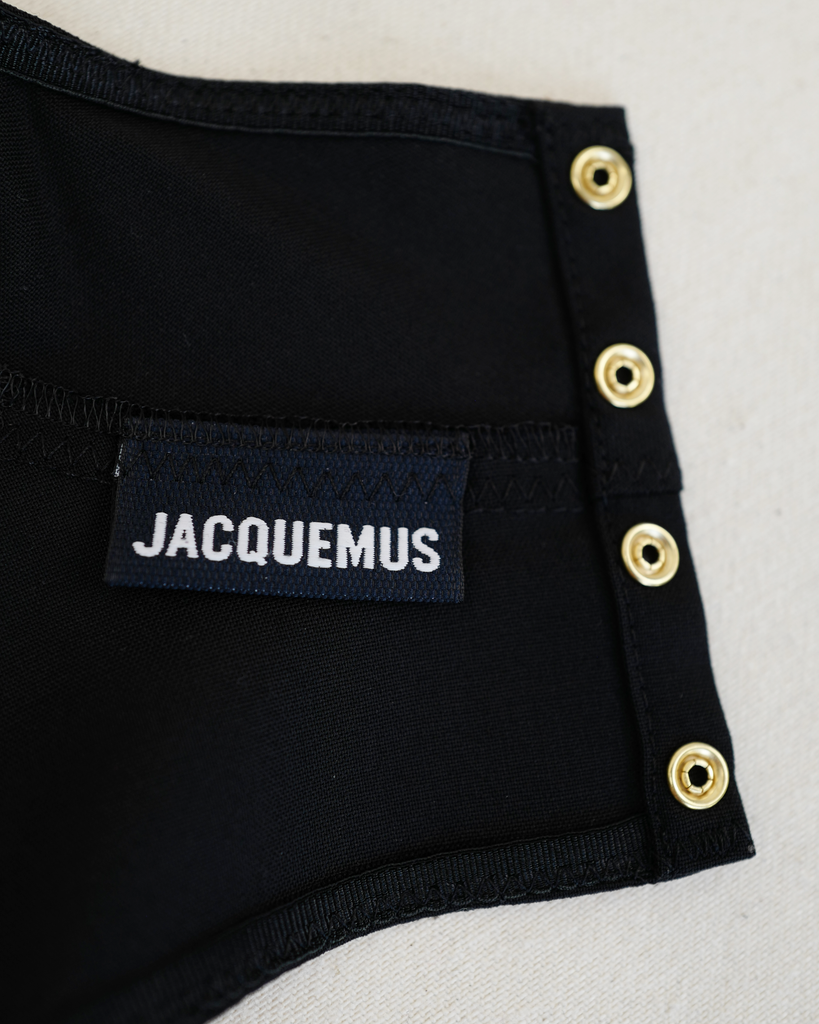 Black Jacquemus top with cut outs and and open back. Closes with straps and buttons in gold metal.
